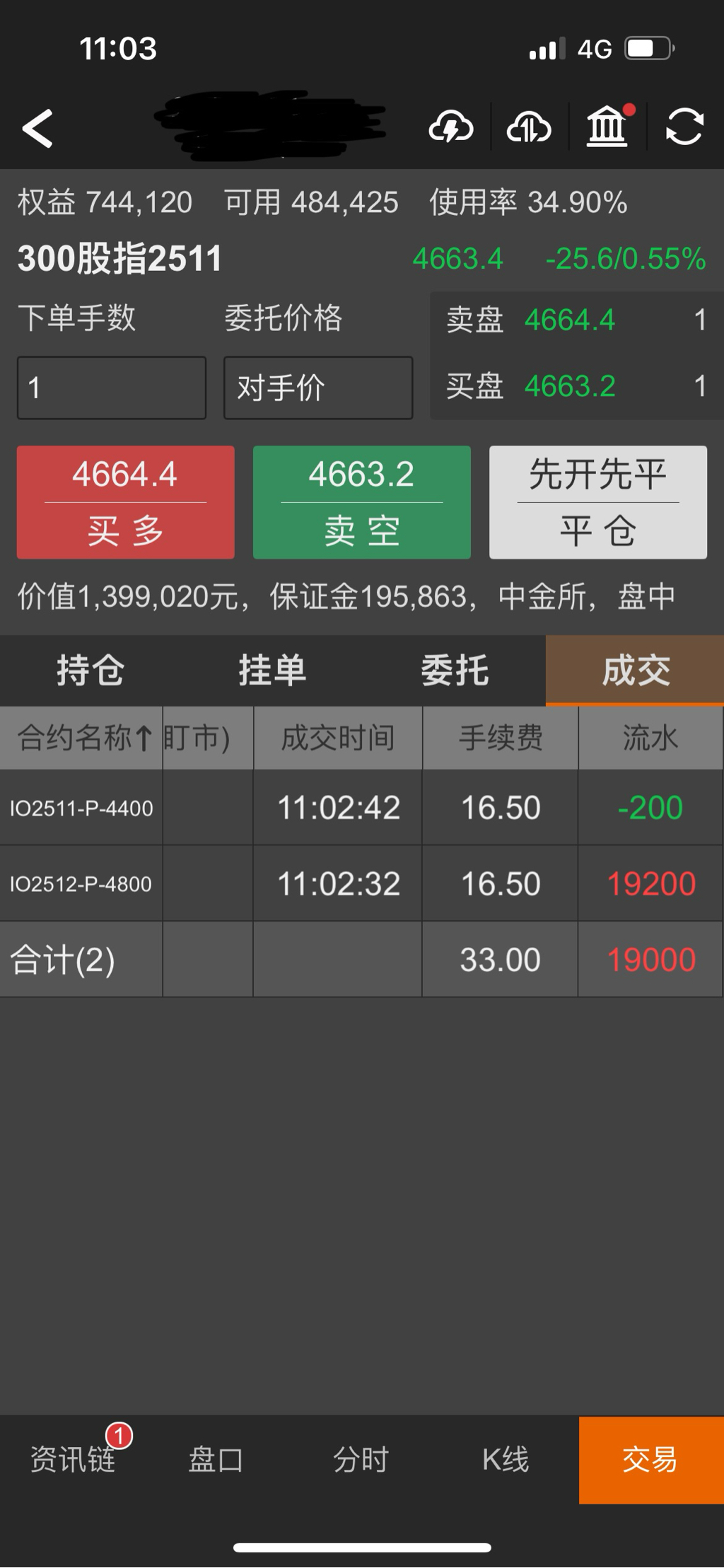 IO实盘账户是因为Delta不够了,所以上移4400卖沽到4800,移仓流水19000元。这个操作盈亏平衡点在4550点附近,指数如果大幅下跌是会亏损的。移仓时沪深300在4670点附近。遇更大的调整再上移可能会更好,各位同学不要学我上移那么多。单就这个IO卖沽4800而言,我是做好了浮亏的准备的,下跌再继续移仓虚值卖沽。宁愿被套,也不想踏空,囧!