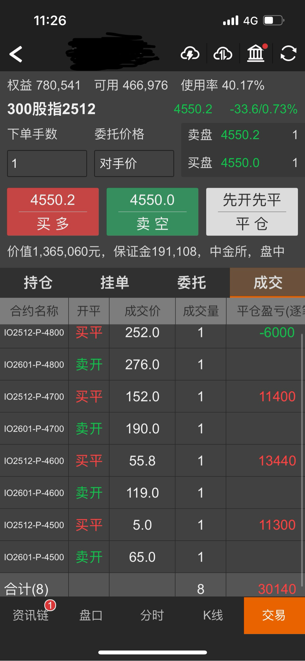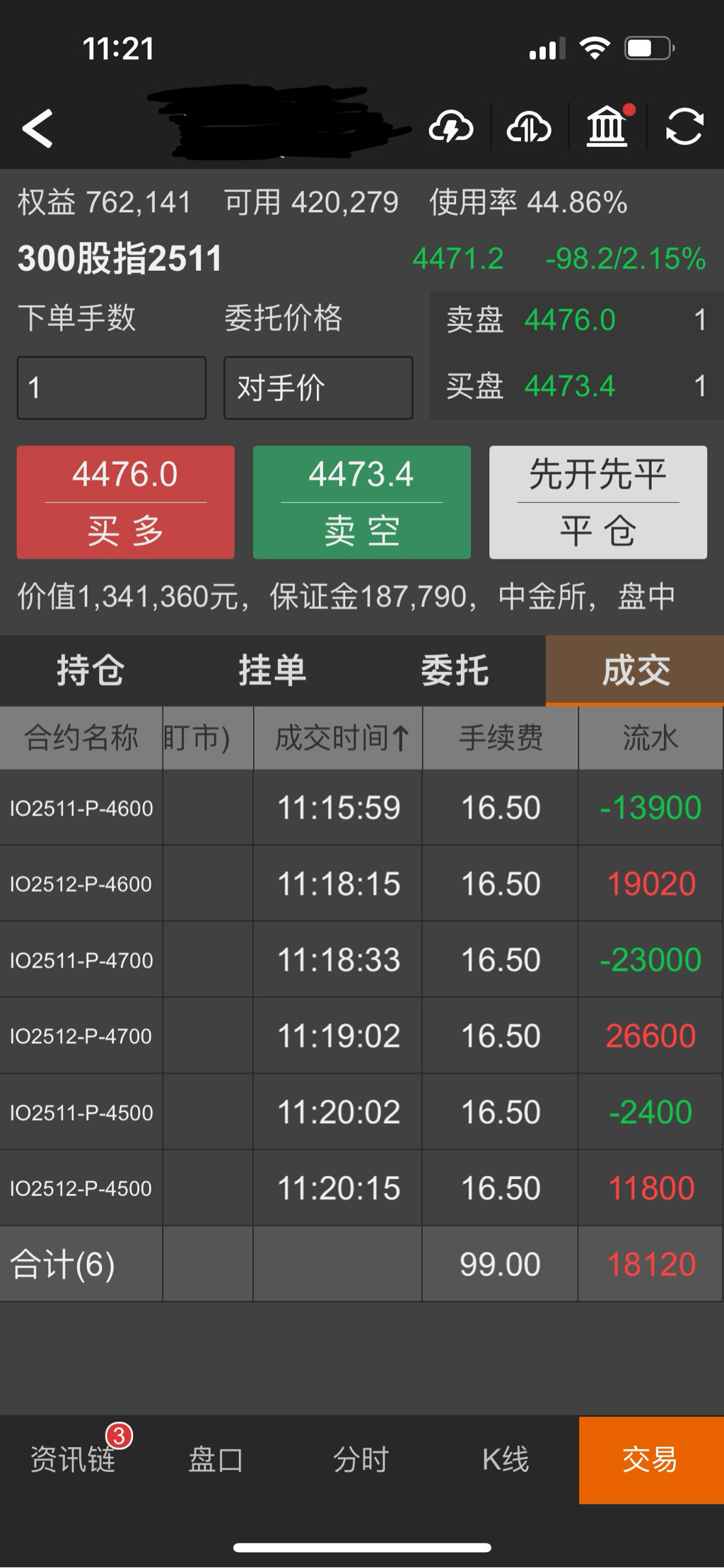 现在实盘账户IO卖沽是4500,4600,4700,4800,覆盖了一个区间,卖沽实值平值虚值都有,可以应对震荡行情,破区间再考虑调整和加仓。
