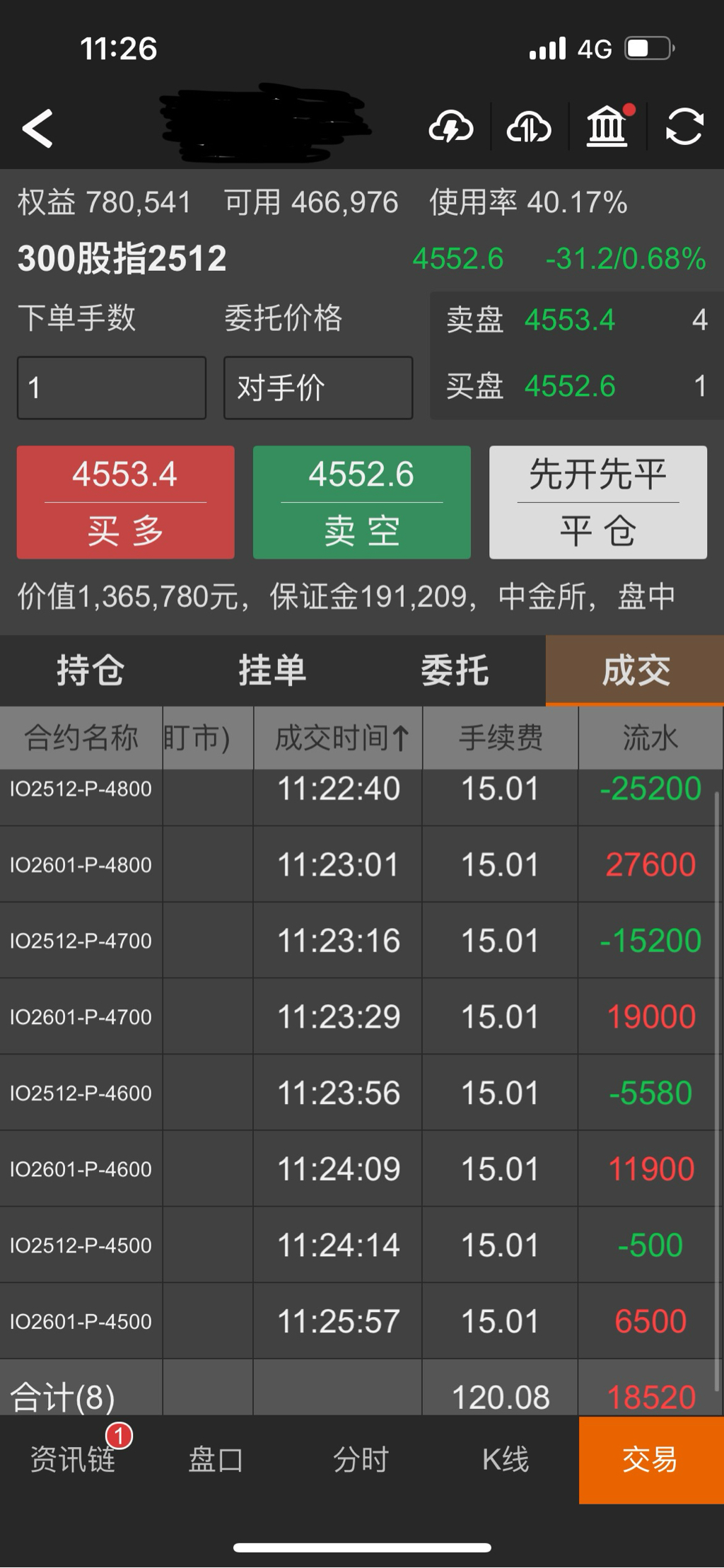 上证指数跌到了3840,移仓IO。沪深300在4500下方运行了,4700卖沽平仓亏损,3张卖沽平仓盈利4500元,移仓流水18120元。