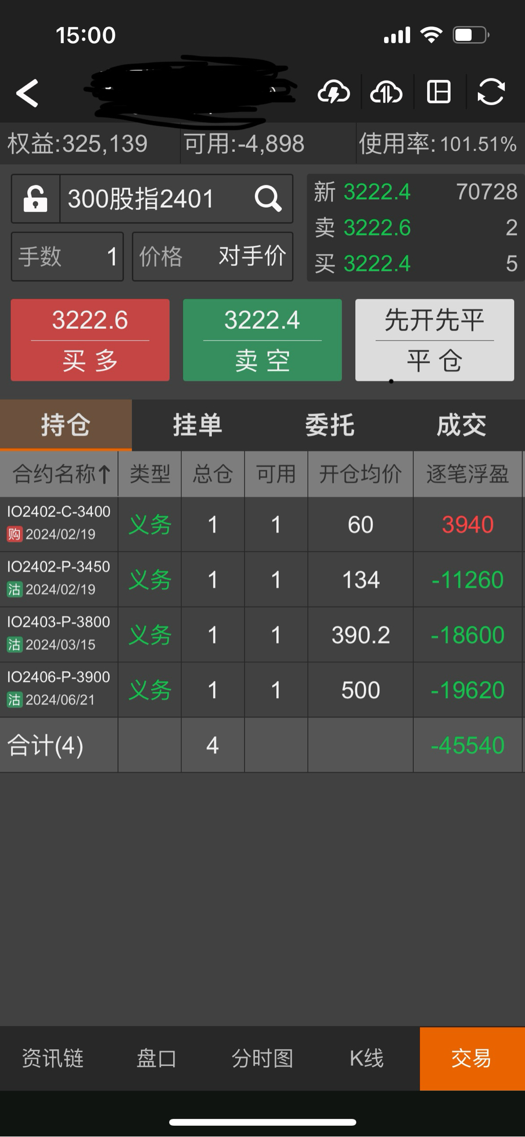 1.盘中资金使用率一度超过100%,结算以后保证金下降,确认还没有爆仓^_^ 这个跟原来计算的差不多,双卖可以支持到沪深300指数跌到3200点不用减仓,时间价值不多了,可能需要下移。