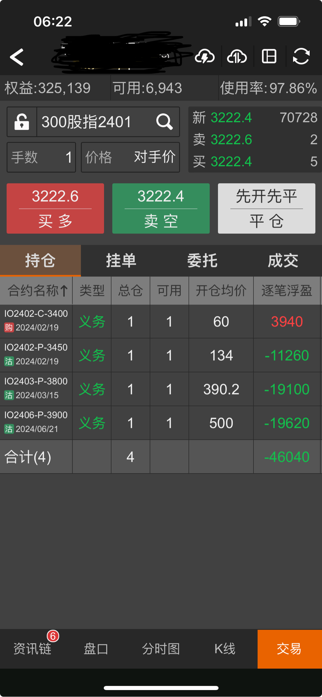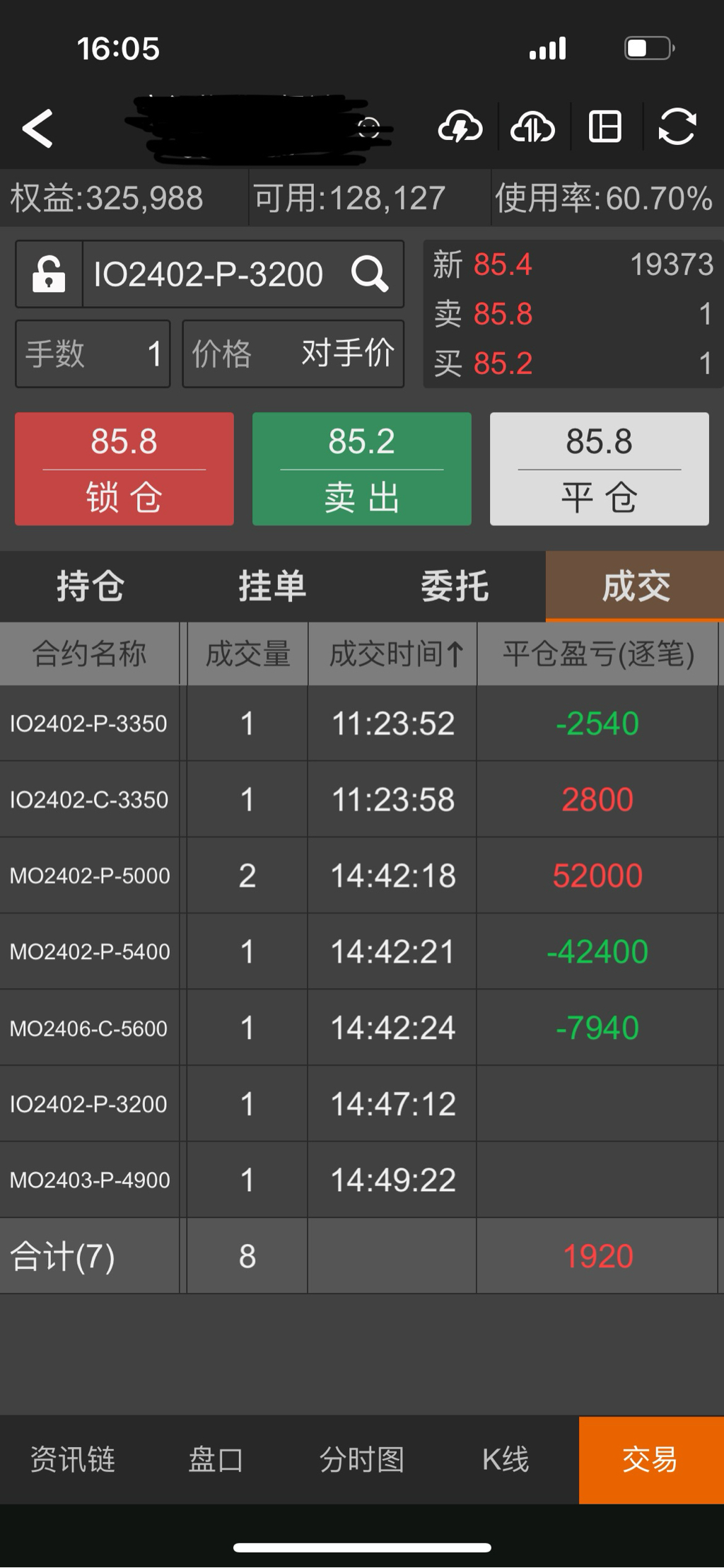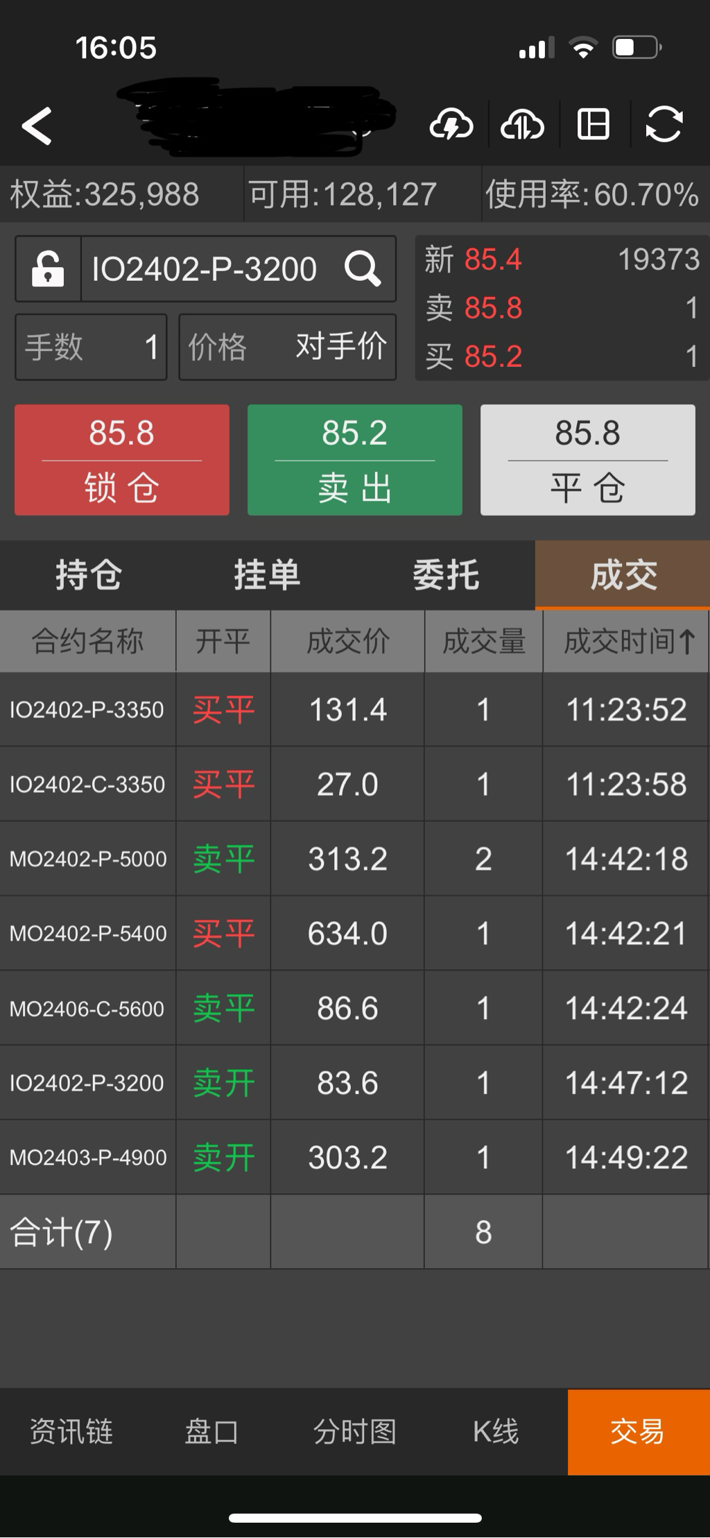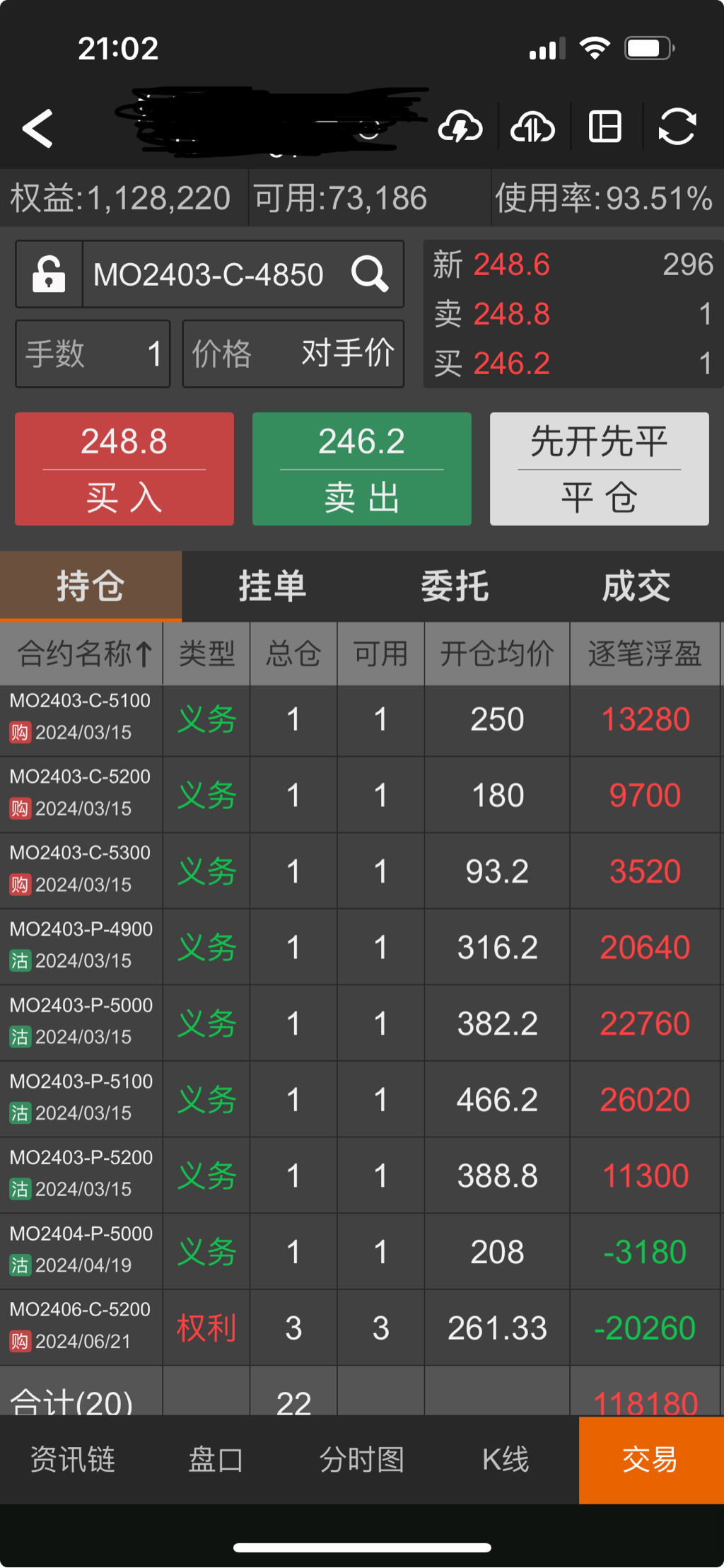 3.这个账户资金少,追加十万MO卖沽也开不起,一张保证金就要6万,操作次数也不多,不做短线,还是双卖移仓收租为主,等底部明确了慢慢加点买购吧。MO在其他账户做,操作和持仓有得有失,就不贴图了。暴跌对于有钱加仓的同学来说是机会,加杠杆要注意对冲保护,爆仓的同学就只能一路割肉止损,注意安全第一。