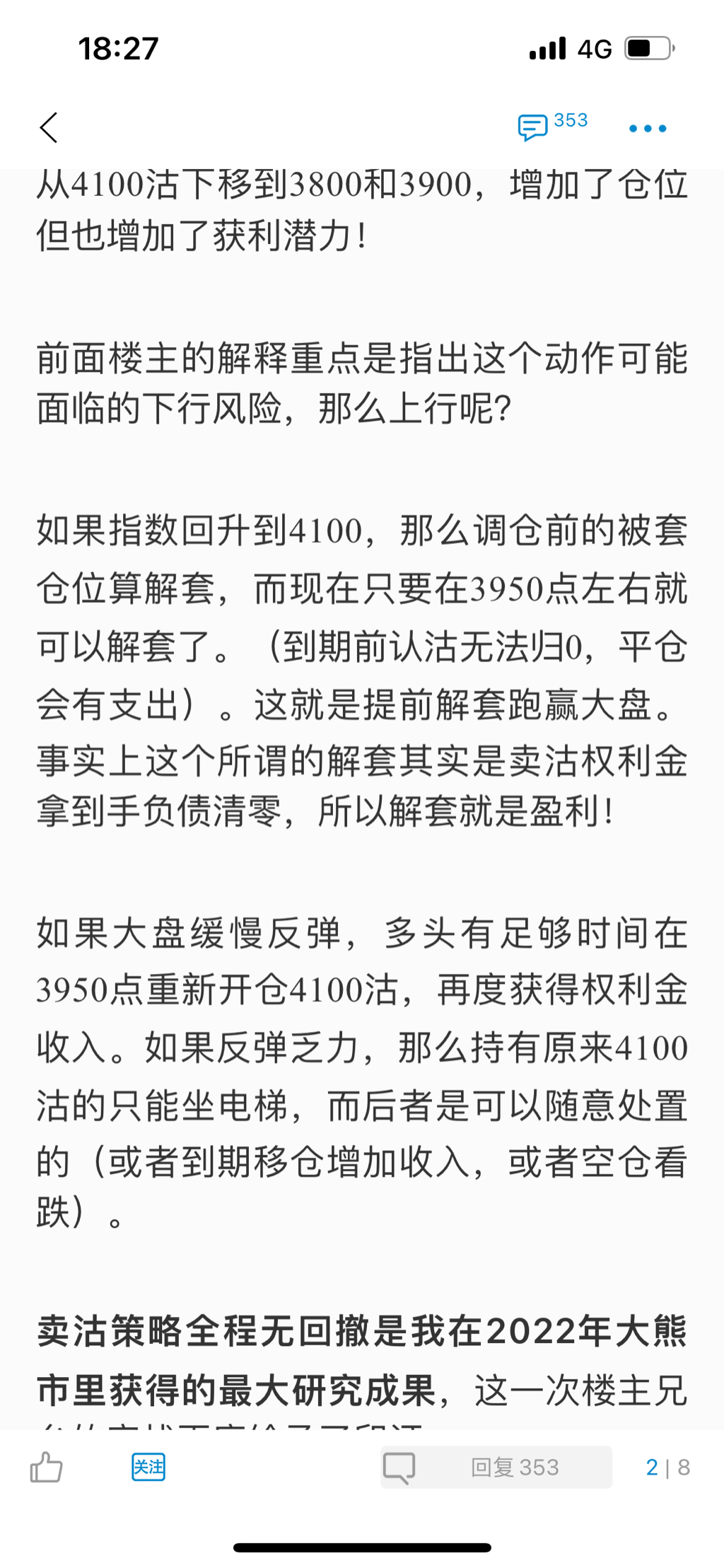 你这个观察角度和计算方式是可以的,移仓说明我已经明确了下移主要就是为了增加时间价值。我说一下结论,短期暴涨暴跌如果跟着频繁操作移仓是完全有可能亏损的。下移不加仓就需要时间换空间,Delta是减少的换Theta。下移并加仓就是抄底接货Delta增加并增加Theta,同时承担继续下跌的风险。下移加仓的话在指数反弹到3950整体回本也是可以计算的,这个跟在底部震荡的时间有关系,总之时间对期权卖方有利。只要不继续大跌,横盘移仓几次以后赚钱也是确定的,不涨不跌也能赚钱才是我作为期权卖方的优势。至于说反弹上行的情况,参见建淞兄在5月31日的点评。我的操作原则就是上涨就上移就好了。