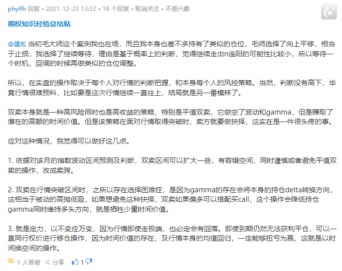 3900的比较明显没有跑赢指数的涨幅。买入时,现货3807,期权权利金165当前,现货3963.65,期权权利金49现货差值156,而期货差值115.4大佬虚值后少了差不多40.6,相对于3963.35-3900=63.65多了23个点对应16天的时间价值。实转虚的少赚,大佬是怎么看的?2307-P-4000 权利金为102如果这个时候向上移仓到4000,则等同于认亏47点,我这么理解没有错吧遇到大涨行情期权卖沽跑不过指数是正常的呀,P3900都变虚值了,Delta随上涨减小,这个就是期权的特点啊,所以我有上移P3800到P4000的操作嘛。哈哈,你这个计算要按整体来,我4100开的仓,今天3950就持平开始赚钱了,这个效果是下移加仓和期权时间收益都做出了贡献,你不能只算P3900的收益嘛,把P3800和P4000的收益都加上,还要减去原来P4100亏的钱才是总体收益,另外还要减交易手续费。你看我的账户总资产和持仓就能算出净值赢利多少了。