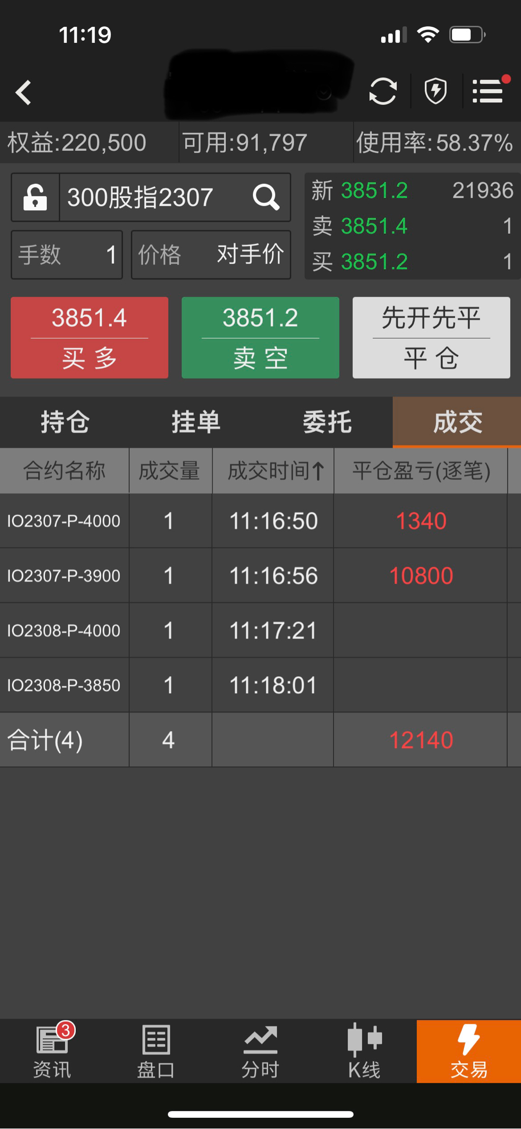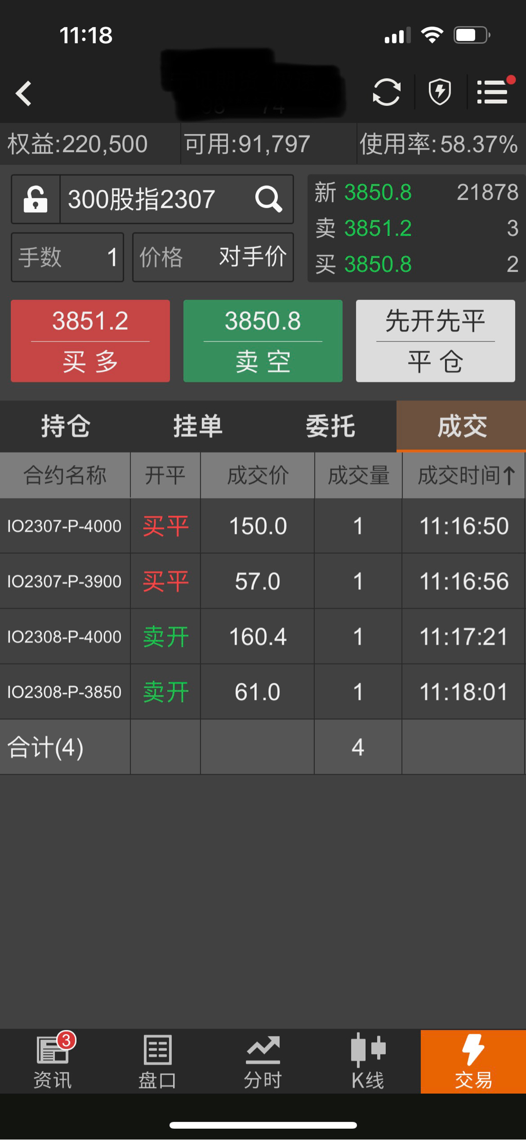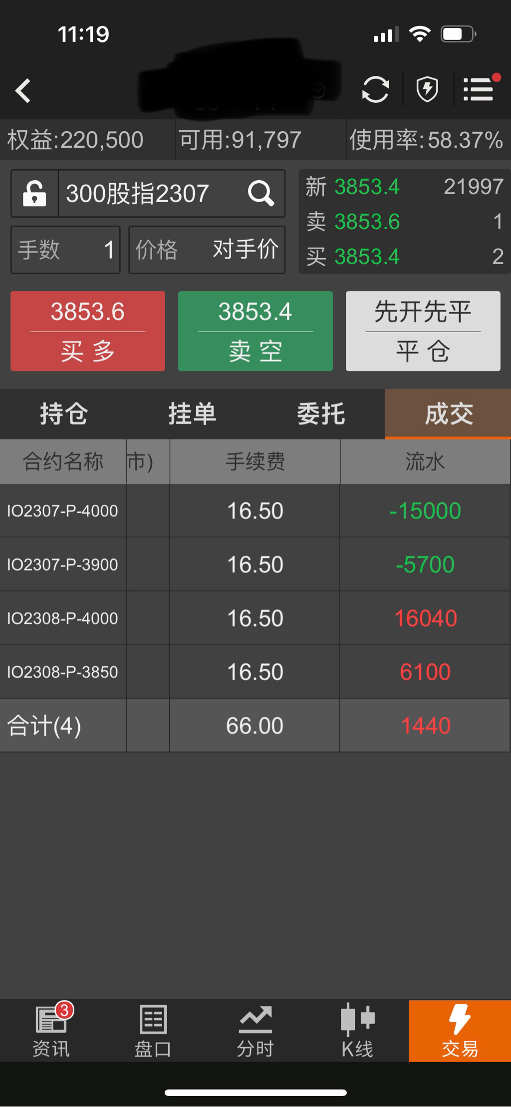 2、因为昨天上涨加降波,加上7月期权也快到期了,卖沽的收益兑现得比较多,20万的IO账户开始赢利了,现在的成本大概在3880左右。新的账户建仓可以按照这个下跌升波再加倍加卖沽的方式来建仓。同理,卖购的建仓也是等到上涨升波以后,上移卖沽的同时开卖购做双卖做空波动率,这样做的成功率更高一些,低波的时候做双卖要慎重。