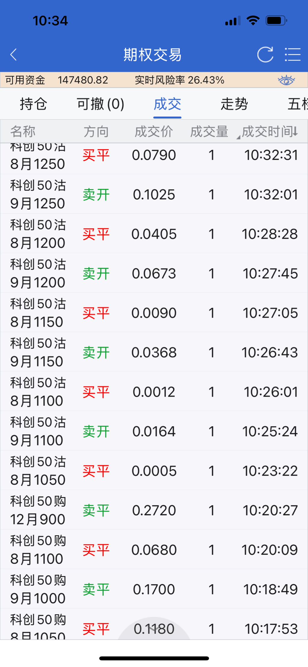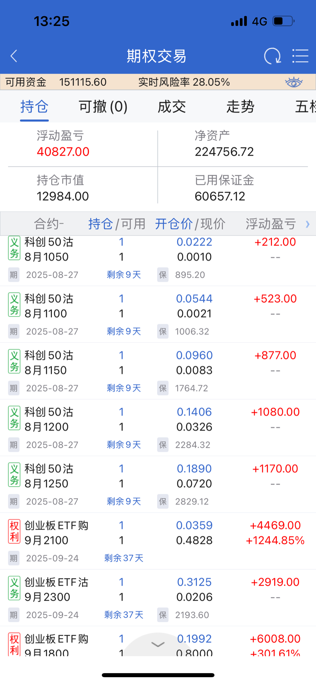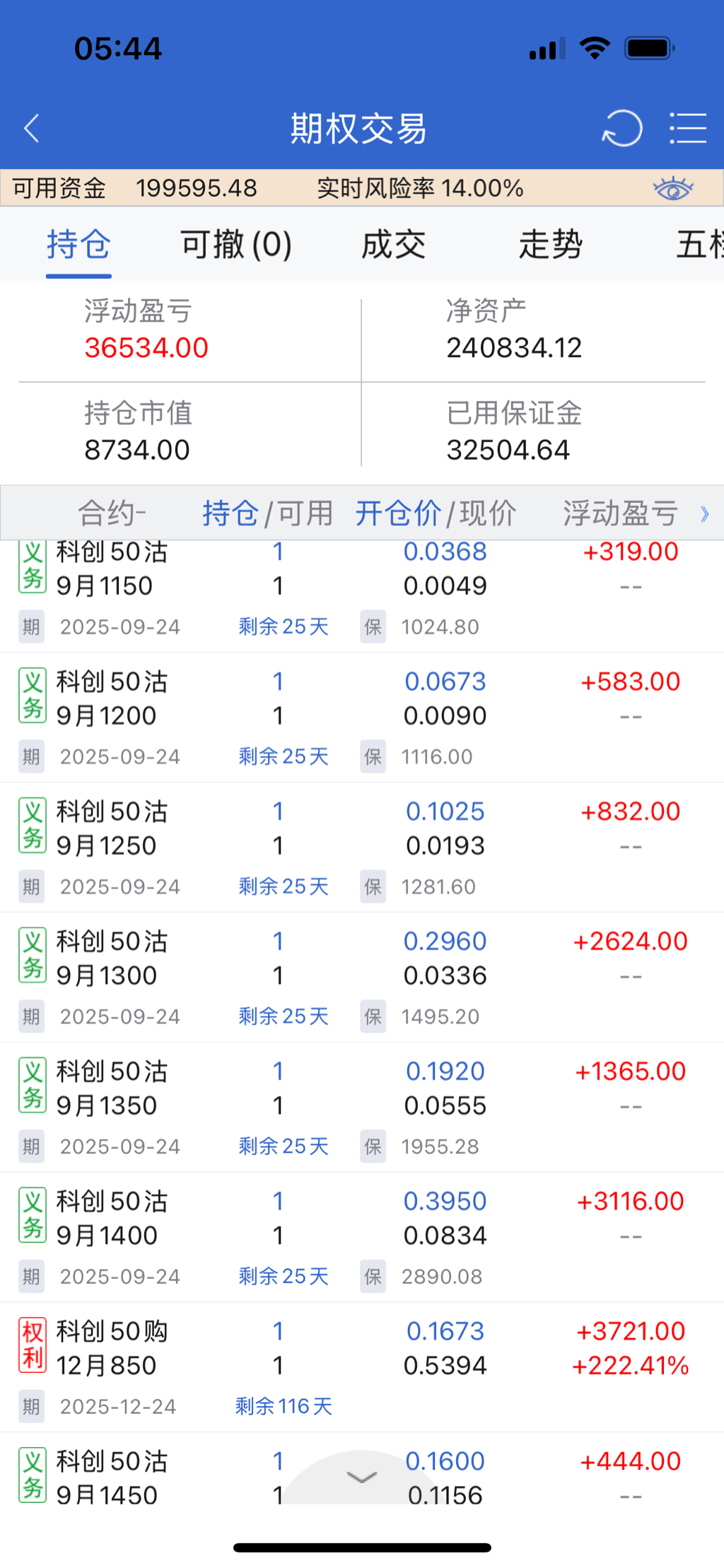 期权卖方是一个天然的高抛低吸的品种,卖购看不涨,卖沽看不跌,收益是有顶的,爆发不够。账户不管就随上涨自然减仓,可以看到风险度降低到14%了。平值和实值卖沽正常移仓操作,深度虚值就不做卖方了。