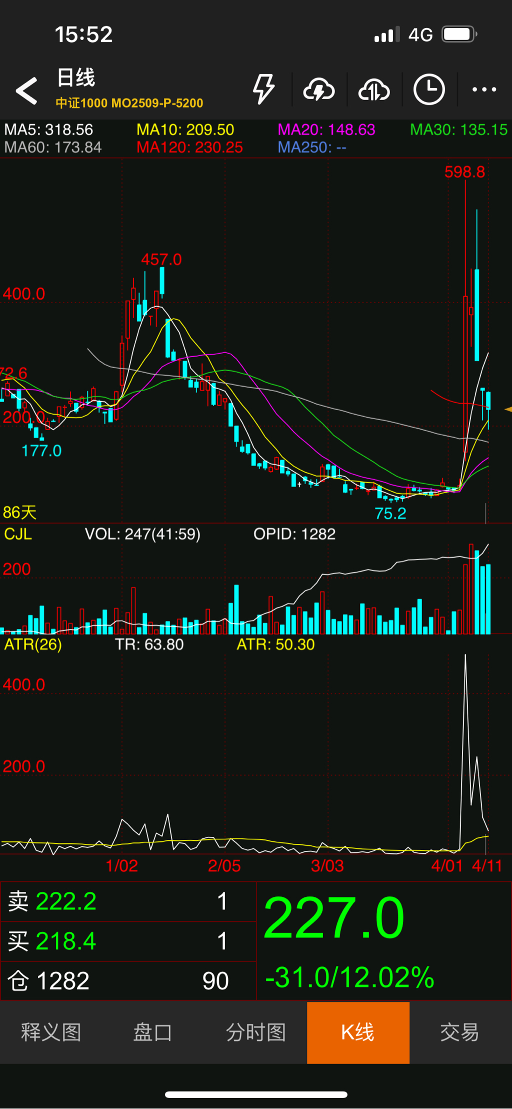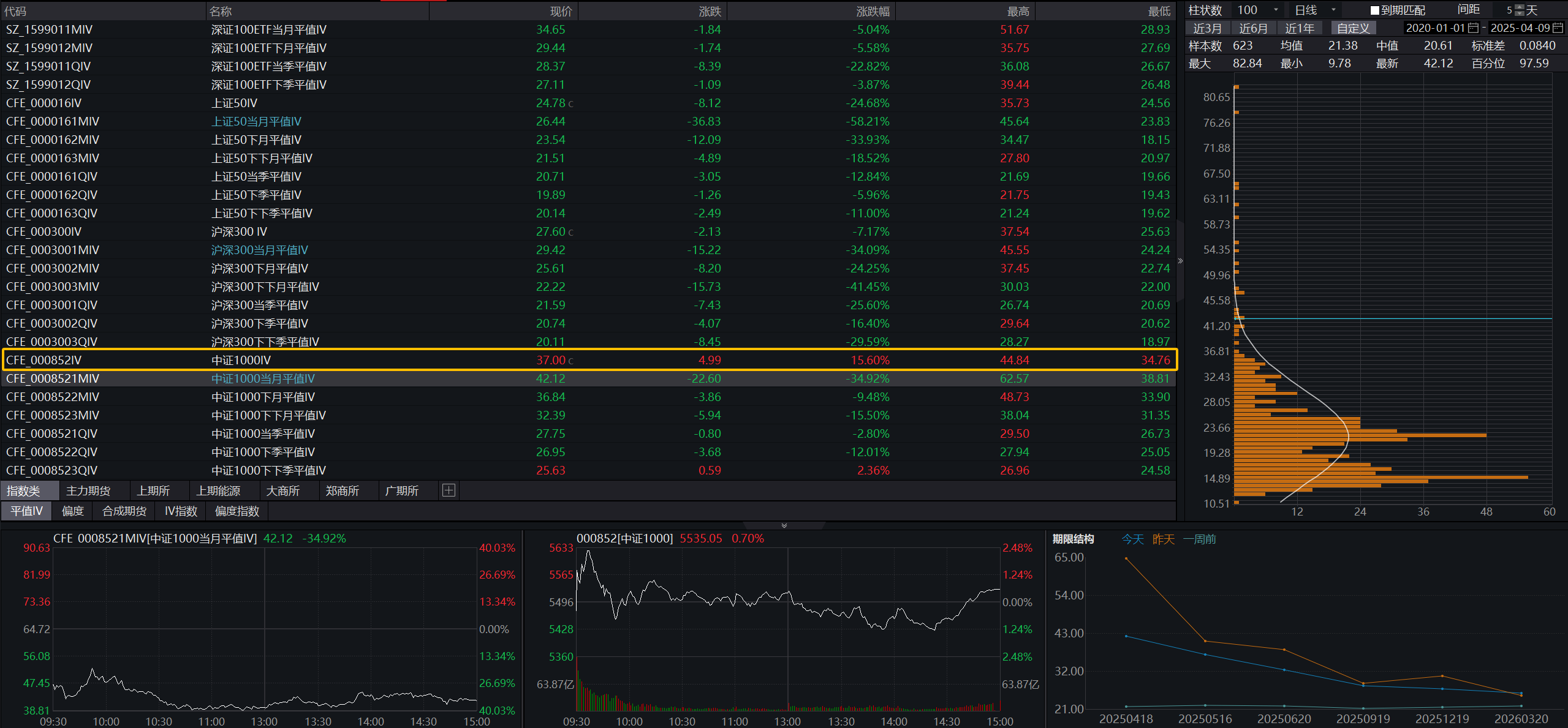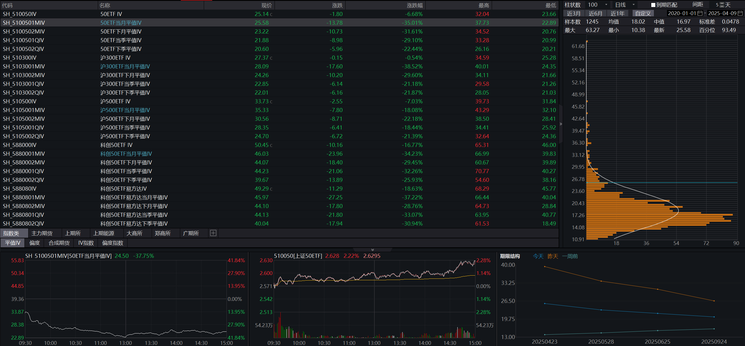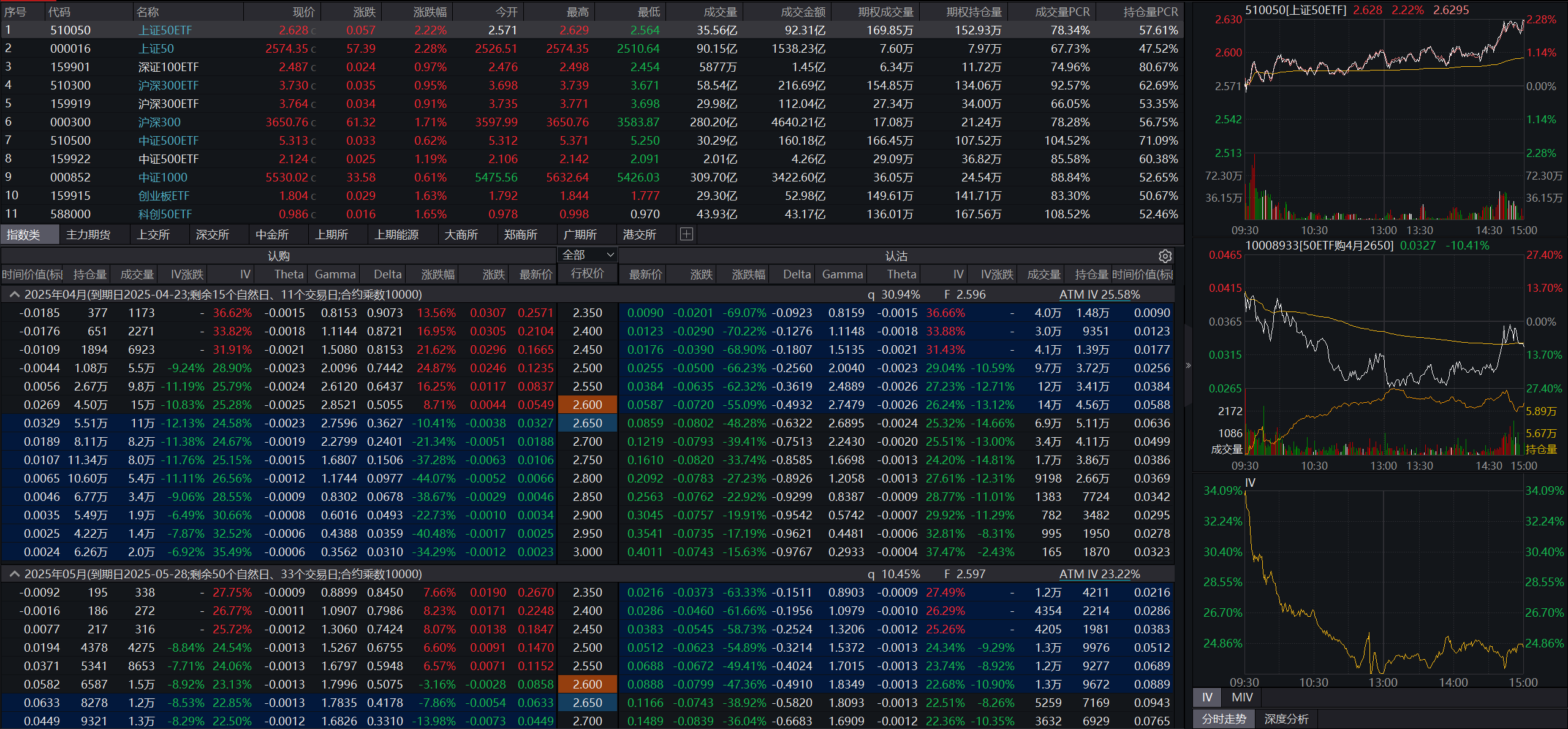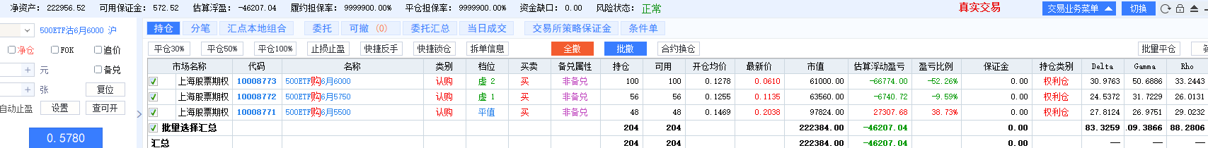另一种选择就是深度实值买购的隐波低,升波的时候虚值隐波高,可以考虑开正比例价差卖虚值购,当然这个要等上涨趋势结束以后再做,不要逆势。判断下跌趋势了还可以加买沽,用领口策略来保住买购的收益。用期权做套保比用IC,IM空单的选择更多。特别是正比例价差在降波行情挺好用的。科创板和创业板我就准备留实值买购并移仓正比例卖购。趋势走坏了再考虑买沽合成空头,这样比IM空单体验更好一些。