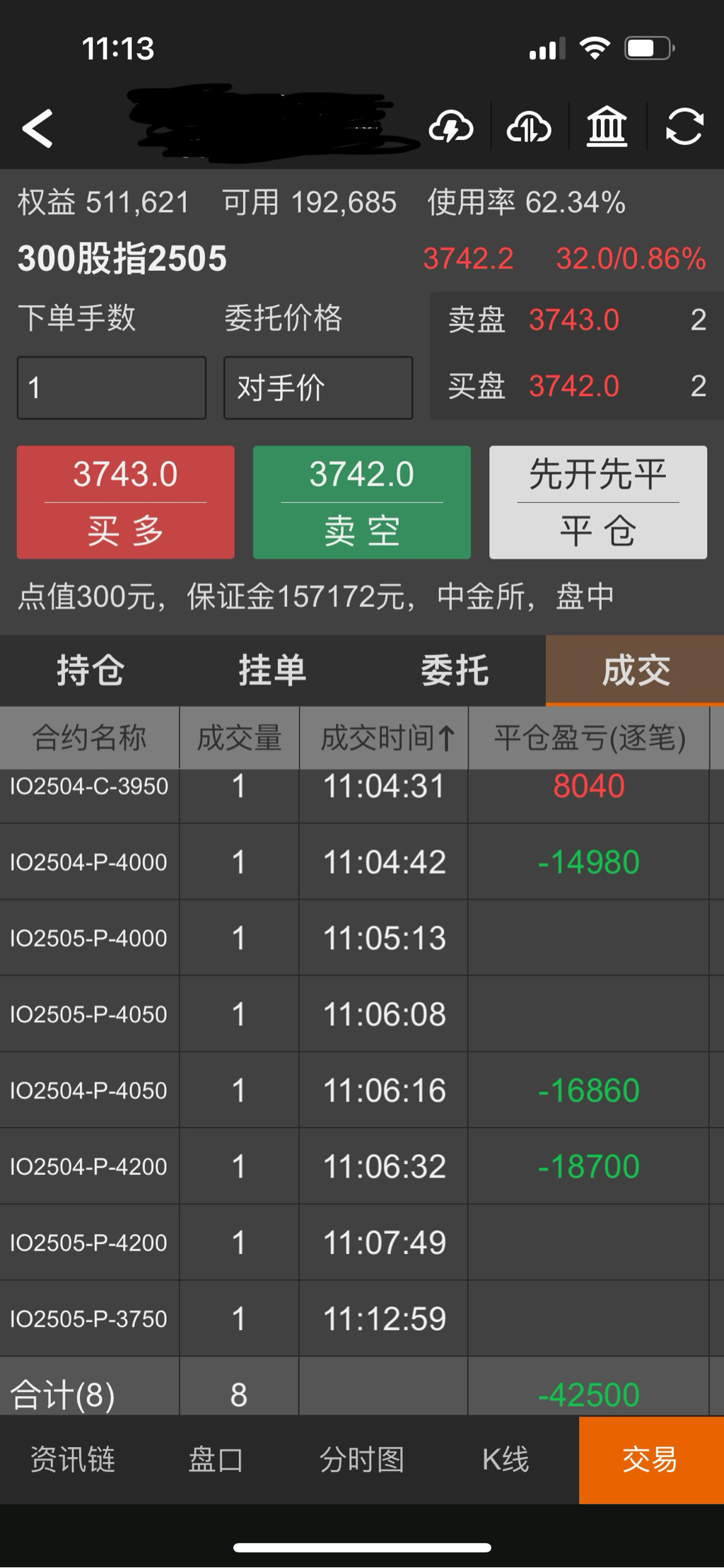 资金管理:在风云诡谲的资本市场,最重要的事情是生存。保证账户的安全,首先要有反脆弱的资金管理方案。为什么9债1购值得借鉴,这个就是杠铃法则的应用,大部分资金放在债券和固定收益品种中,小部分资金冒高风险博取高收益。实盘IO账户3张卖沽已经相当于接近100万的仓位,对应的必须要有现金支撑,否则杠杆就太高了。再强调一次,卖沽替代的是现货ETF仓位,没有保护的裸卖沽是风险很大的。而在期货和期权市场中,永远不要满仓梭哈,保留足够的现金应对极端行情是非常重要的。