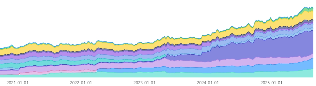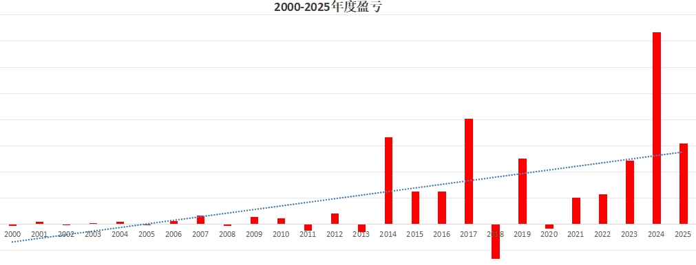 今天为止基本上也算是半年了,算下今年收益12.1%,还好。今年的总市值、年度股息收益都是历年最高。2000-2025年度市值、盈亏、股息额统计。