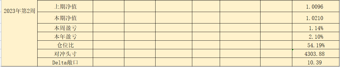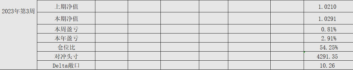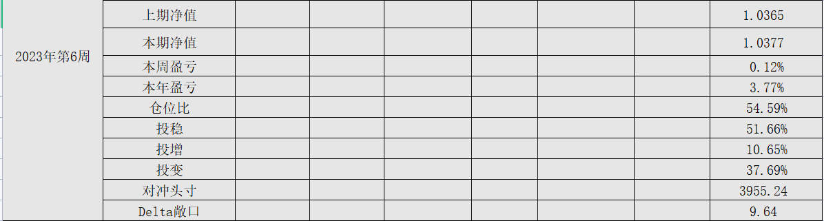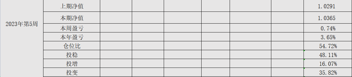 2023年第5周,净值:1.0365,本周盈亏:0.74%,本年盈亏:3.65%,仓位:54.7%