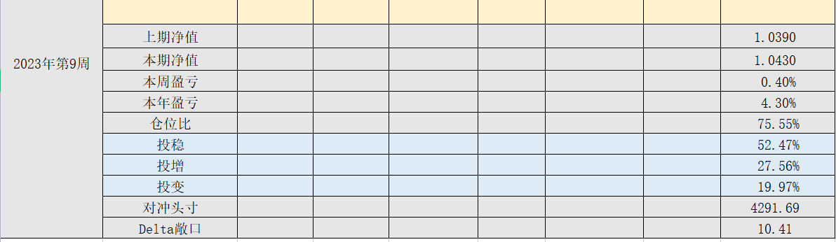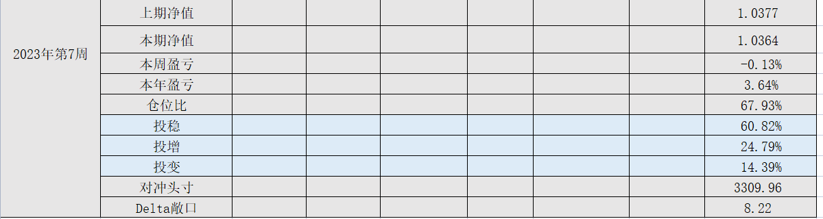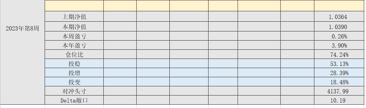 2023年第8周,净值:1.0390,本周盈亏:+0.26%,本年盈亏:3.90%,仓位:74.24%