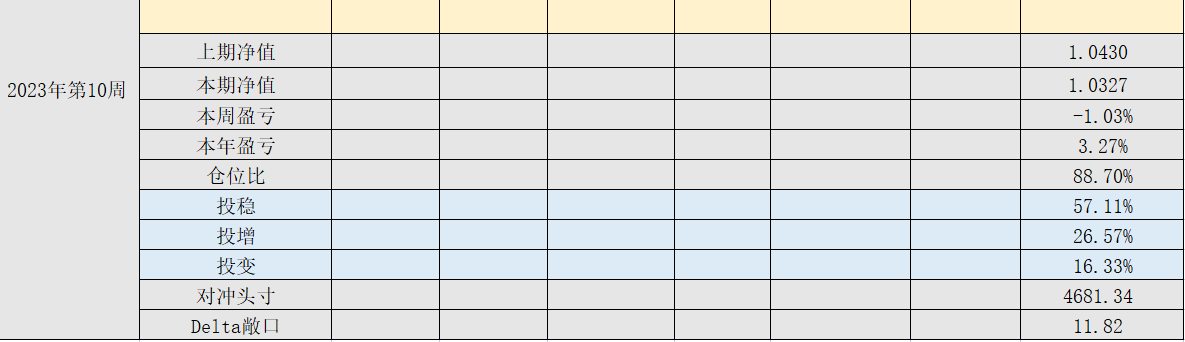2023年第10周,净值:1.0327,本周盈亏:-1.03%,本年盈亏:3.27%,仓位:88.7%