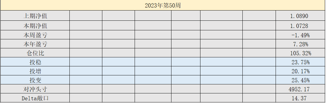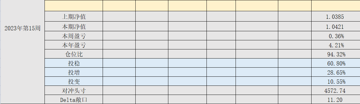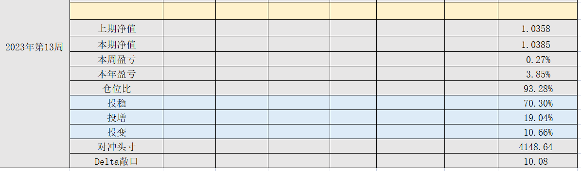 2023年第14周,净值:1.0385,本周盈亏:0.27%,本年盈亏:3.85%,仓位:93.2%