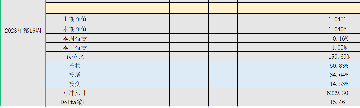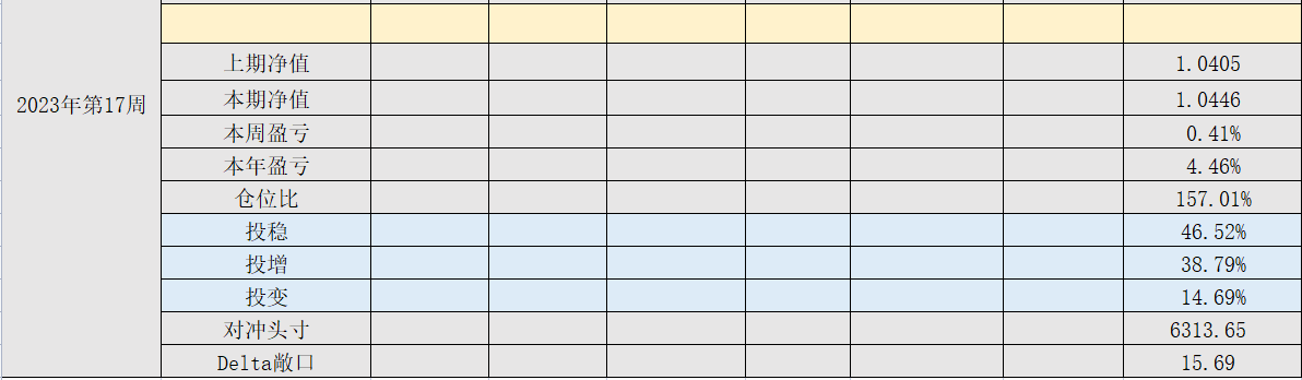 2023年第17周,净值:1.0446,本周盈亏:0.41%,本年盈亏:4.46%,仓位:157%