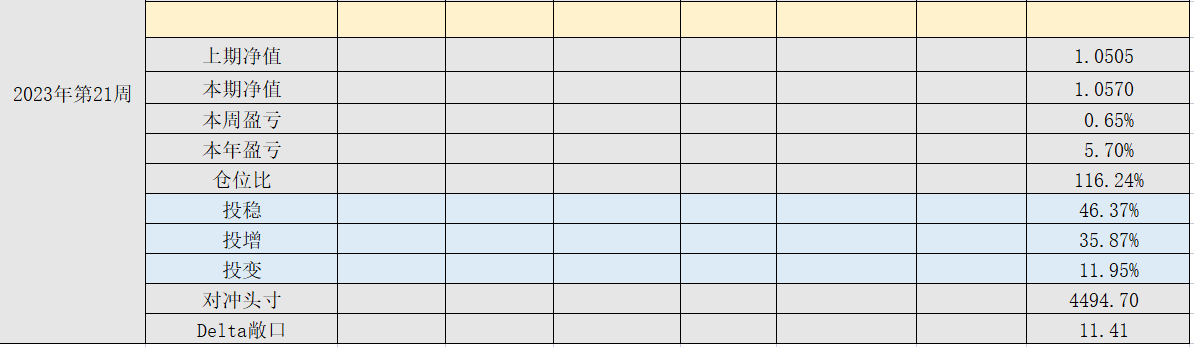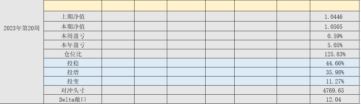 2023年第20周,净值:1.0505,本周盈亏:0.59%,本年盈亏:5.05%,仓位:126%