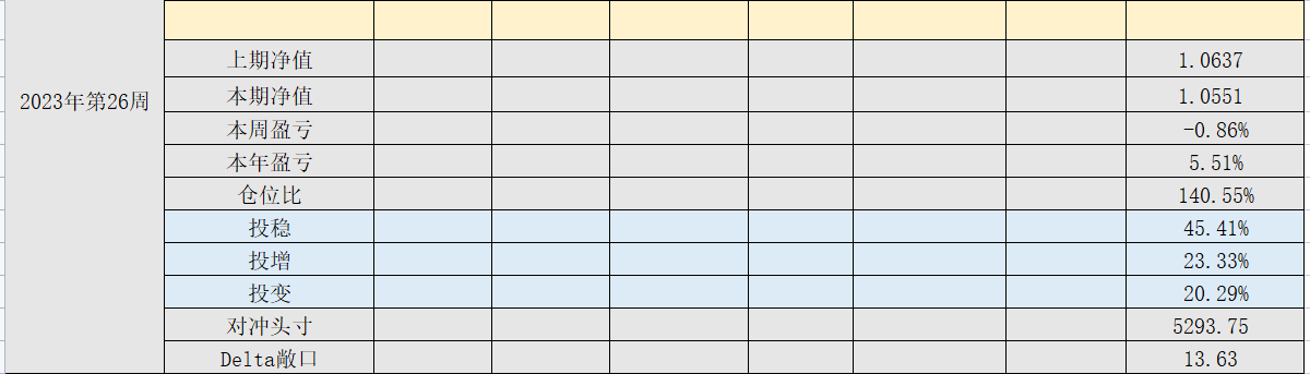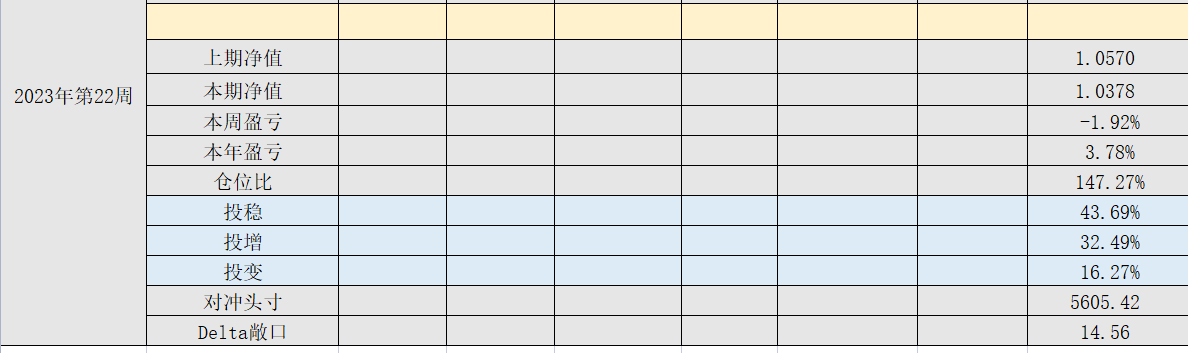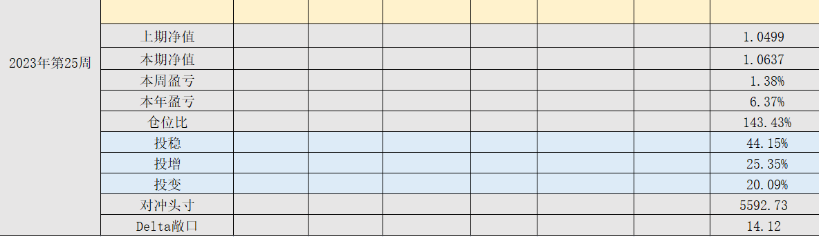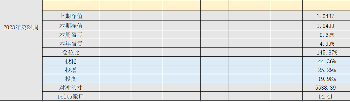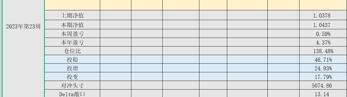 2023年第23周,净值:1.0437,本周盈亏:0.59%,本年盈亏:4.37%,仓位:138%