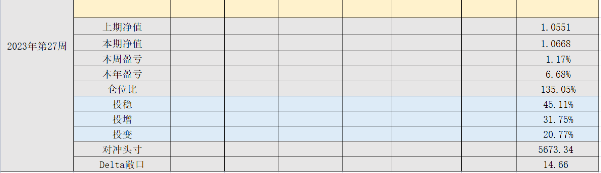 2023年第27周,净值:1.0668,本周盈亏:1.17%,本年盈亏:6.68%,仓位:135%