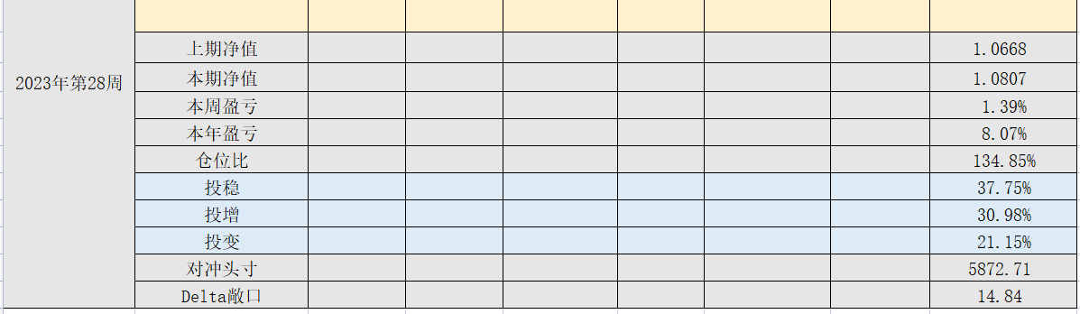 07.14 分红季节2023年第28周,净值:1.0807,本周盈亏:1.39%,本年盈亏:8.07%,仓位:134%