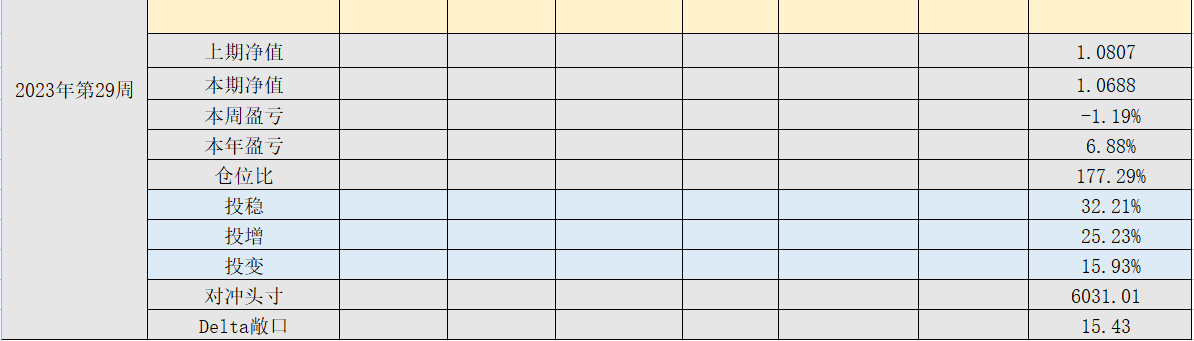 2023年第29周,净值:1.0688,本周盈亏:-1.19%,本年盈亏:6.88%,总仓位:177%本周在银河做了一笔现金管理,算进了总仓位,实际权益仓位变动不大。上周太顺利了,股票,转债,期权等几个品种都有所斩获,年收益到了8%水位,所以这个交易周全面滑落是必然的,盈亏同源嘛,市场老玩家都懂。说几个我经常观察的点:1. 成交量和两融余额,滑入低估范围了,筹码交易冷清,可见多空力量在平衡。2. 消息敏感性,交投冷清意味着全面悲观,对明显前景利好的消息无正面反馈,甚至是负面反馈。例如这周的民企n条,这种级别的消息如果在过去万亿成交量背景下,波动会非常大,各指数集体拉升3%都有可能。3. 期权波动率,大中小指数波动全部在历史10%分位,只差导火索。对于目前市场情况,无论赢或亏都不能轻易离场了,踏空比套牢风险更大,保持一定仓位耐心等待吧,留足安全空间,无非是此消彼长。
