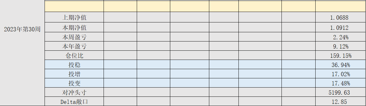 2023年第30周,净值:1.0912,本周盈亏:+2.24%,本年盈亏:9.12%,总仓位:159%按照《不亏》里的理论,分散是弱者体系方法,是对概率和常识的基本尊重。我在多年的投资实践中,确实也在不自觉地遵守分散原则,潜意识中就规避对单一品种的重仓,这个潜意识其实就是心里舒适。在A股市场很难选择几个相关性低的品种,很多时候我是模糊的低相关,例如买高息股同时,搭配一些小盘股,再配置短期理财做平衡;或者买可转债,搭配一些宽基,行业指数,同时期权端做一些防守。套路相对简单,收益也就一般,超额往往来自几笔套利操作,仅仅是小肉。