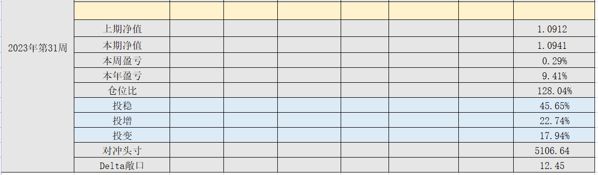 2023年第31周,净值:1.0941,本周盈亏:+0.29%,本年盈亏:9.41%,总仓位:128%如果账户没有配置金融资产,本周大概率输给指数,仓位小了也不行,结构性行情不分牛熊。政策密集一定会催生出政策行情,否则雷声大雨点小,不仅损害公信力,更损害信心,比如老百姓关于房子,车子,孩子上的信心。那么结构性机会应该出现在哪里?根据近期的政策密集区,民营产业将会得到巨大的恩惠,信贷支持,债务延缓,税收减免,投标门槛,资金补贴等等之类的,这些可都是白花花的银子。所谓有钱就有动力,砸钱立竿见影的产业应该就是本轮结构性机会。随便说几个我想到的地方:需要打广告的(美妆,文体,食品),闭眼烧钱的(新汽车,新材料,电力建设)。想法还不成熟,看看分析师们的观点再论,有一点是明确的,在有水的地方去找有潜力的鱼。