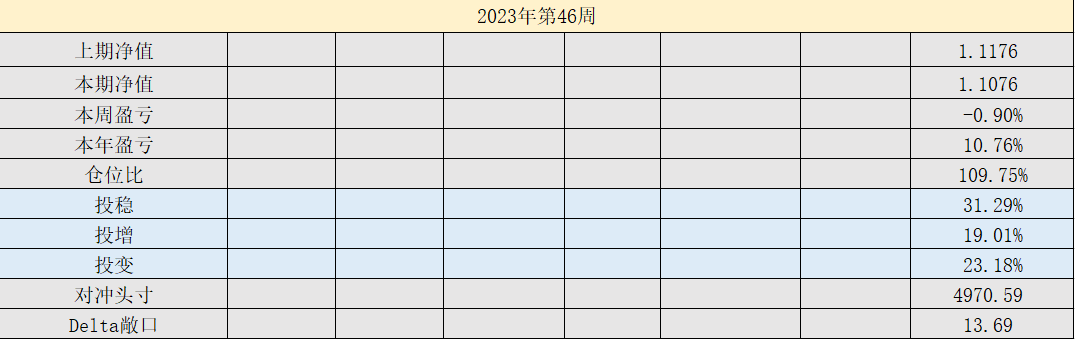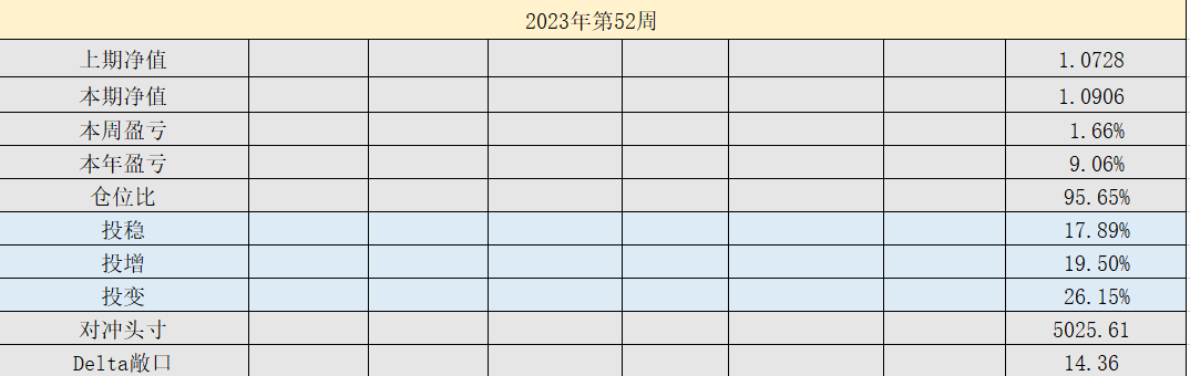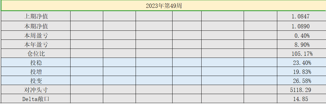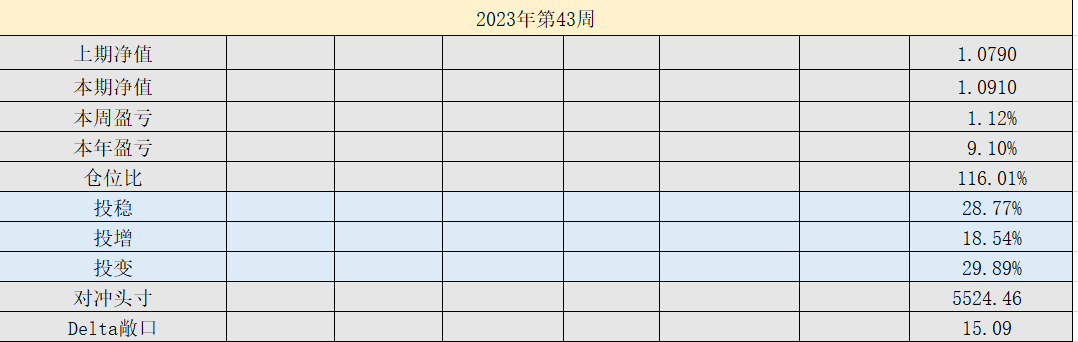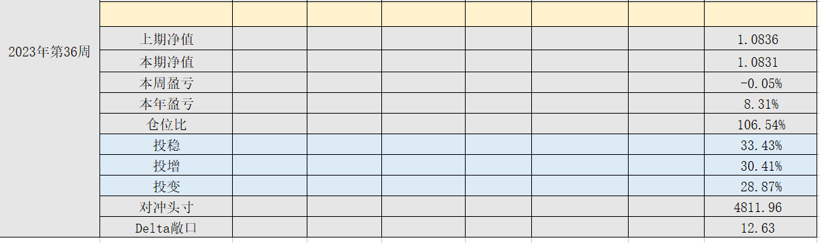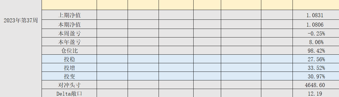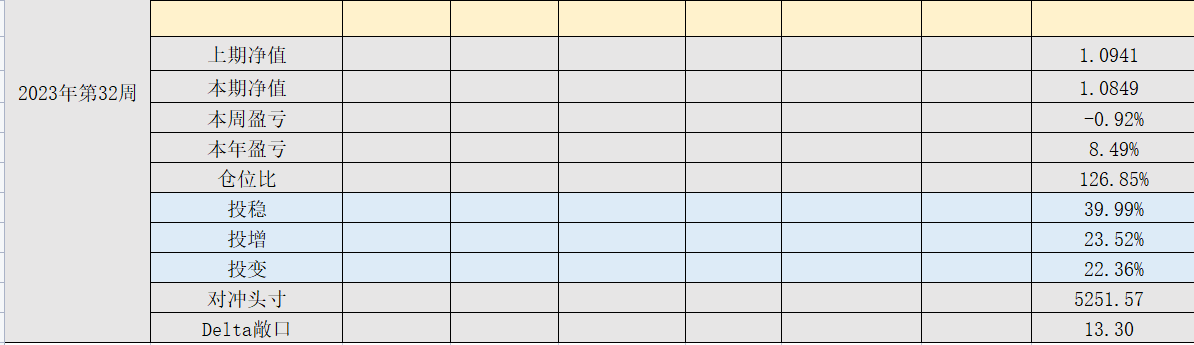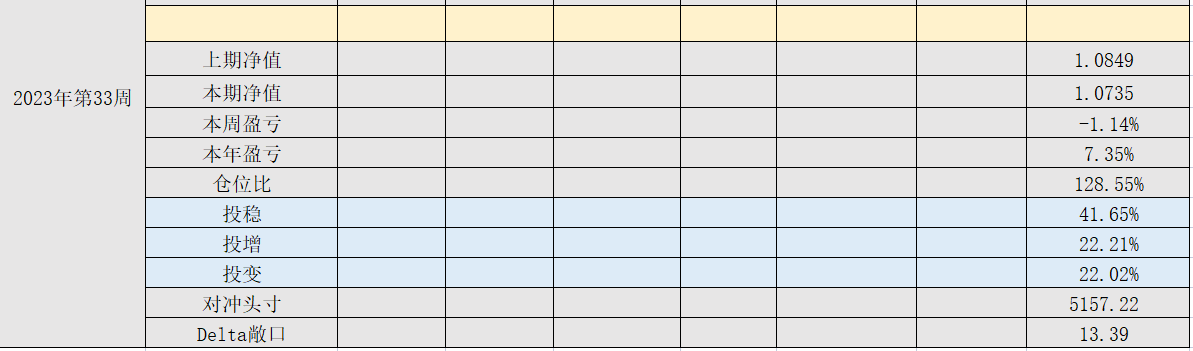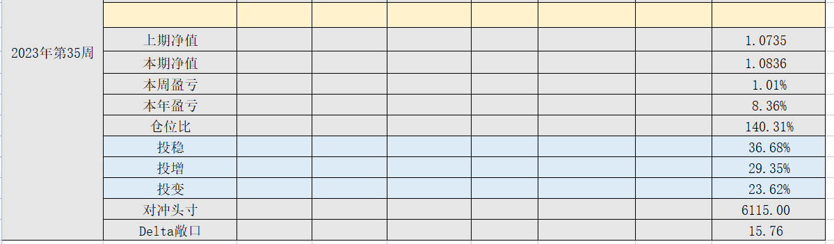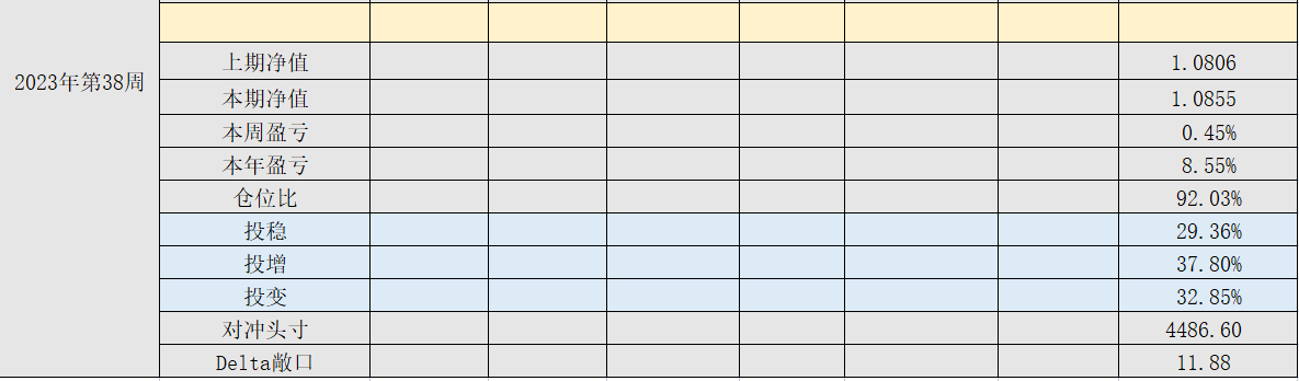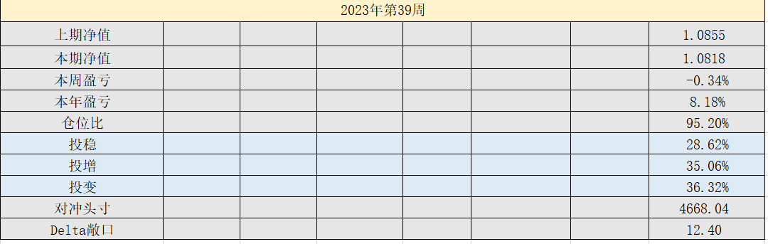 2023年39周,净值:1.0818,本周盈亏:-0.34%,本年盈亏:8.18%,总仓位:95%