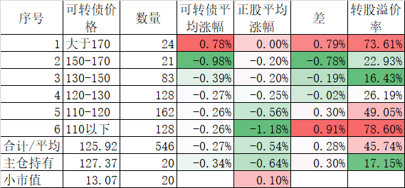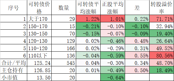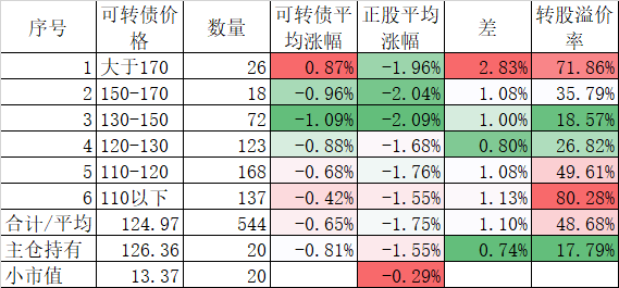 544只可转债平均下跌0.65%,对应正股平均下跌1.75%,正股的跌幅和全市场持平,但可转债跌幅小了不少。