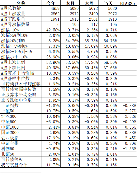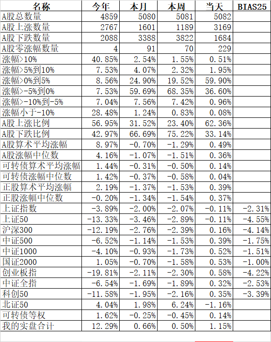 3169只个股上涨,1684只个股下跌,涨幅中位数0.36。今天盘中又是280只个股创出今年新低,不过好在其中175个股收盘翻红。