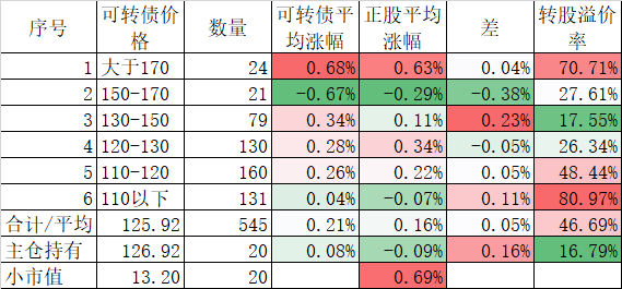 今天我的20只持仓的正股里有7只上涨,而且幅度不小,其中正裕工业涨10.01%、巨星农牧涨3.71%、中国银河涨2.06%、温氏股份涨1.87%、大胜达涨1.67%、普利制药涨0.49%、招商公路涨0.22%。但最终可转债只有正裕转债涨2.17%、胜达转债涨0.13%,其他5只都是下跌的。折价率进一步缩小,还好早上在路上清仓了正裕转债,才勉强跑赢了可转债等权指数。