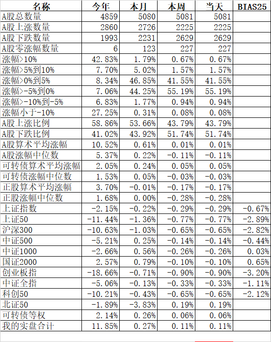 我主仓持有的20只可转债平均上涨0.01%,对应的正股平均下跌0.49%,盘中卖出斯莱转债买入了春秋转债,买入后春秋转债涨的比较好,所以最终实盘平均上涨了0.11%,略微跑赢可转债等权指数。