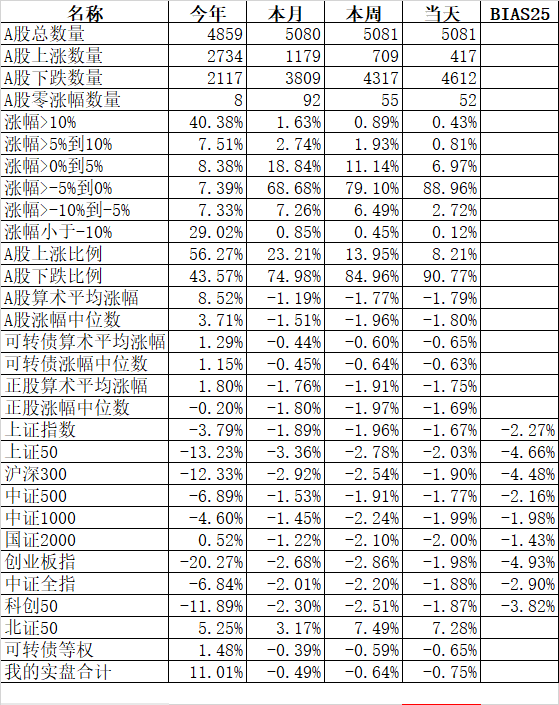 1519只个股创出今年新低低迷的情绪在盘面继续发酵,跌的毫无抵抗,今天还是因为重阳节没有北上资金流出。 主流宽基指数中跌幅最小的上证50跌0.81%、沪深300跌1.04%;跌幅最大的北证50跌2.77%、科创50跌2.51%。申万一级行业指数中今天全部下跌,跌幅最小的行业指数中食品饮料跌0.35%、国防军工跌0.50%、银行跌0.71%;跌幅最大的综合跌3.06%、电力设备跌2.96%、有色金...