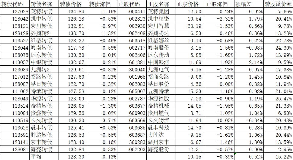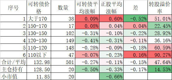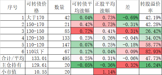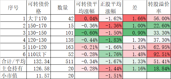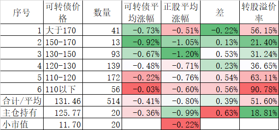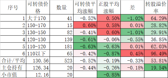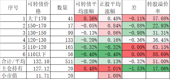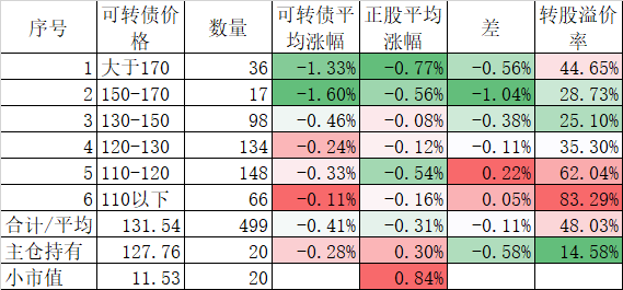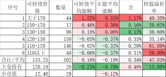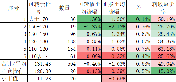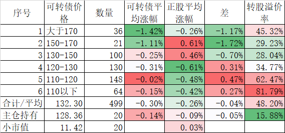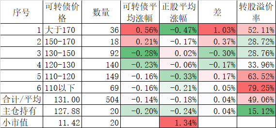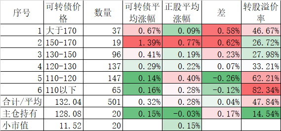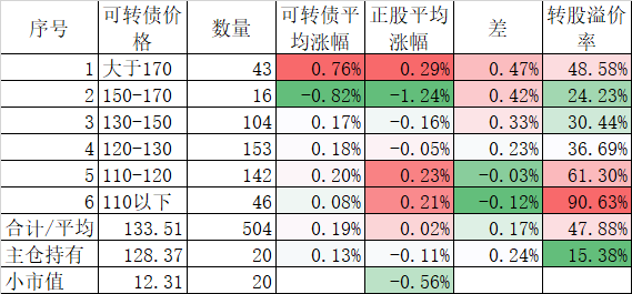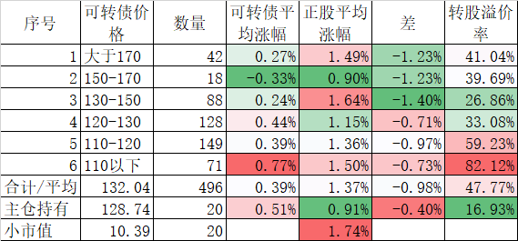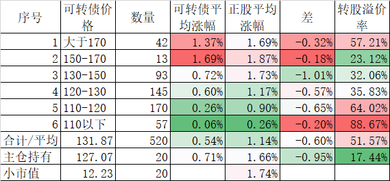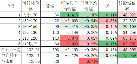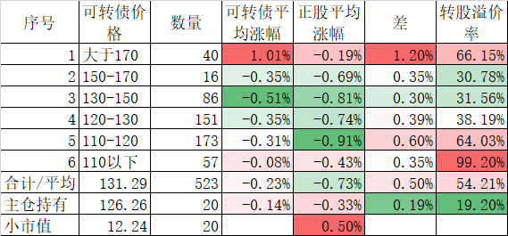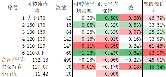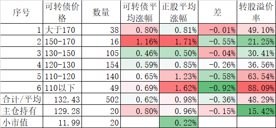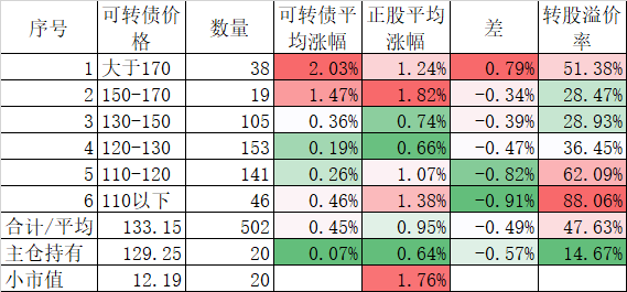 看我的主仓的20只可转债,因为没有双高债,平均价格只有128.74%,平均溢价率也只有16.93%,所以正股平均涨了0.91%,可转债涨了0.51%,正股涨幅不如全市场平均,但可转债涨幅反而超过了全市场平均,主要还是低溢价率在起作用。