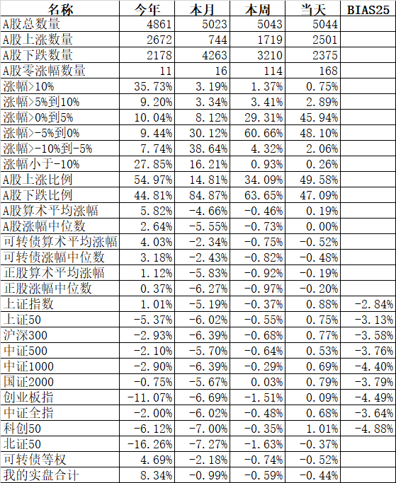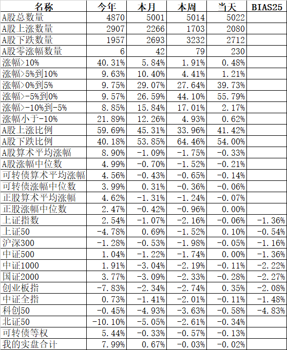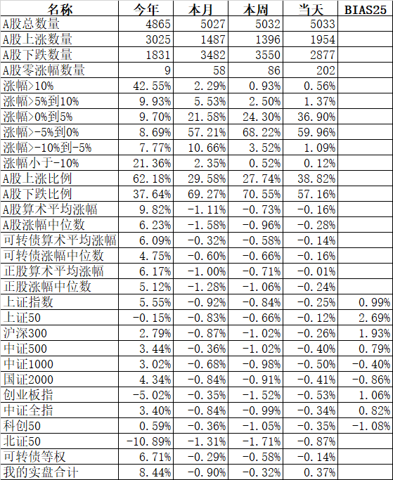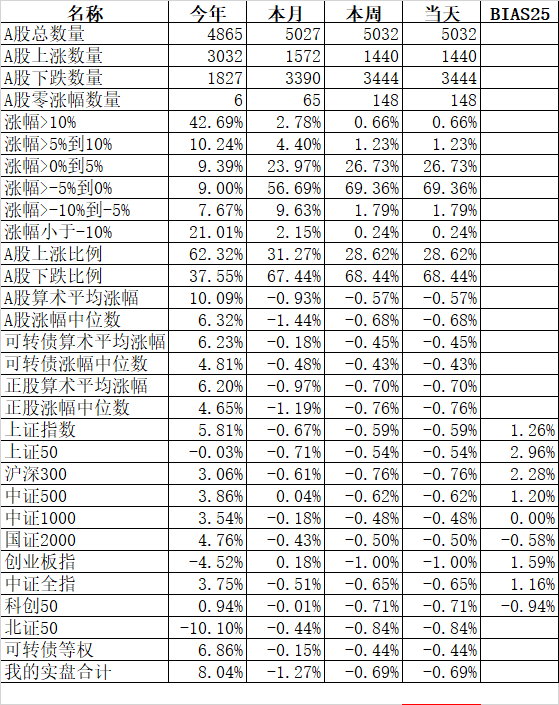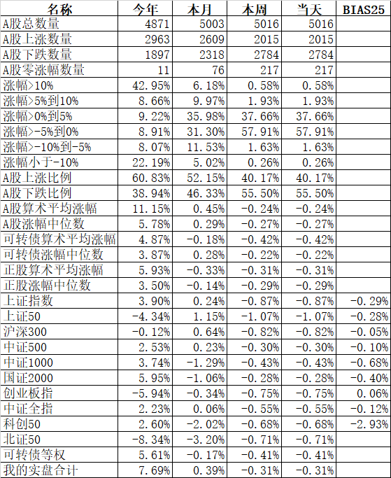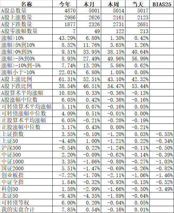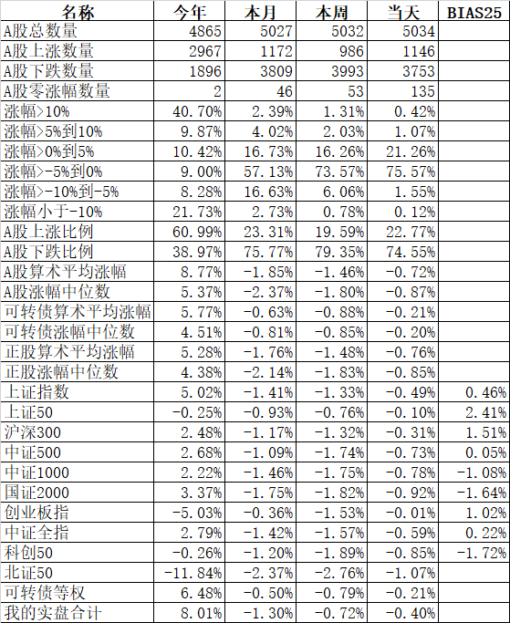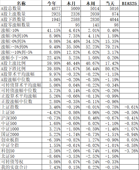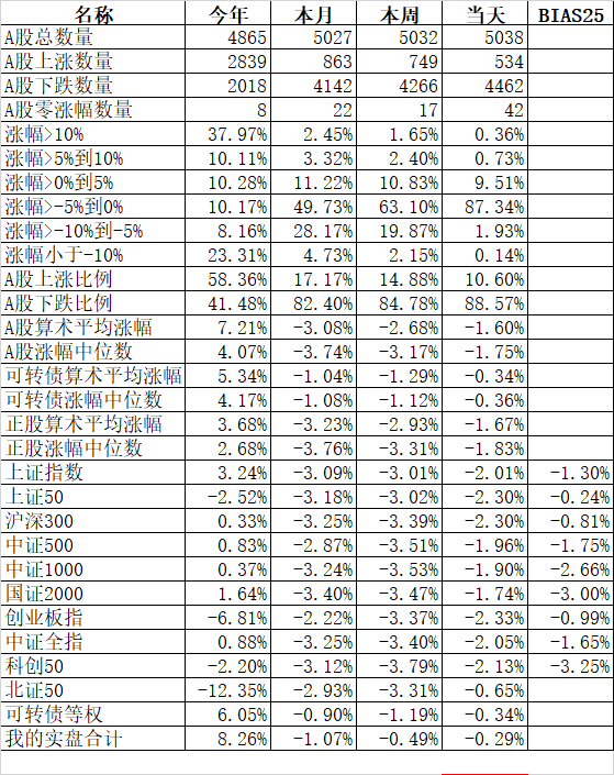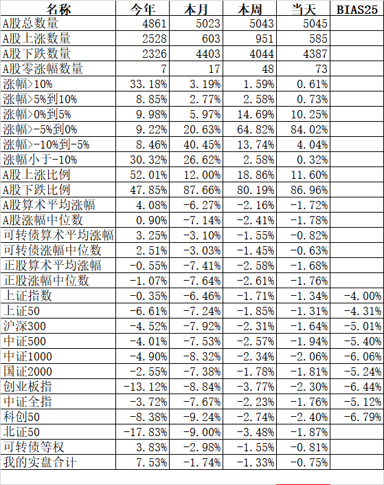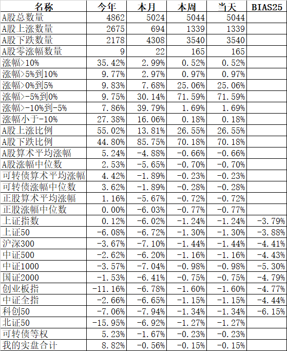 585只个股上涨,4387只个股下跌,涨幅中位数为负的1.78%。经过今天这样一跌,今年个股的涨幅中位数只剩下0.90%了,但今年还是上涨的个股比下跌的个股数量多,而主流的宽基指数全部在水下,说明今年的行情还是个股优于指数,可转债、小市值今年表现相对好些就不奇怪了。