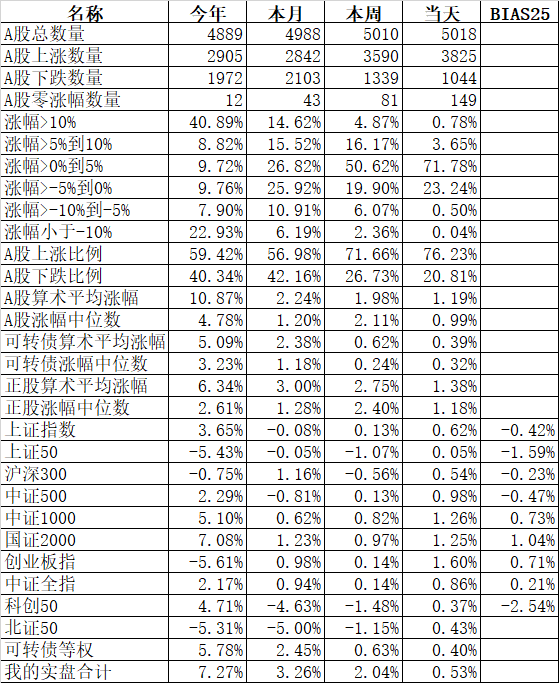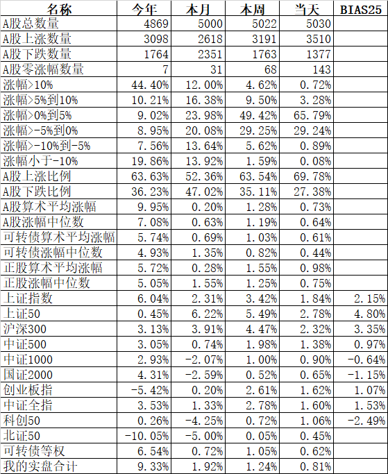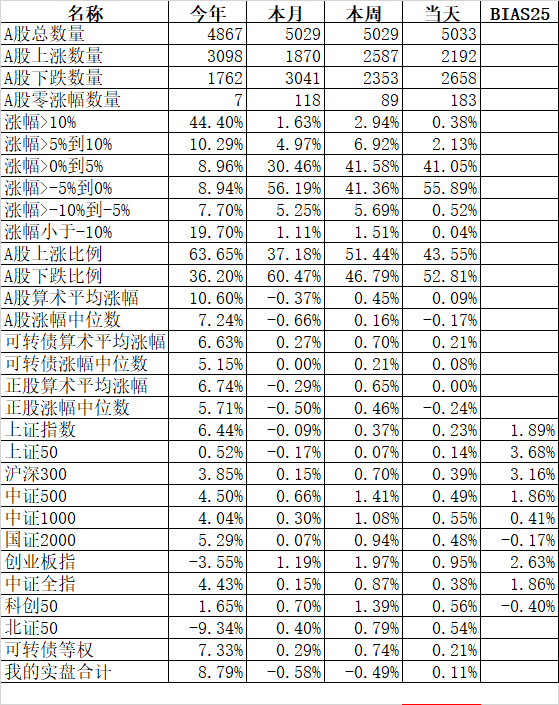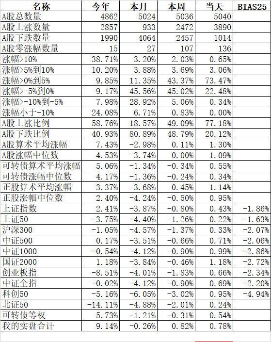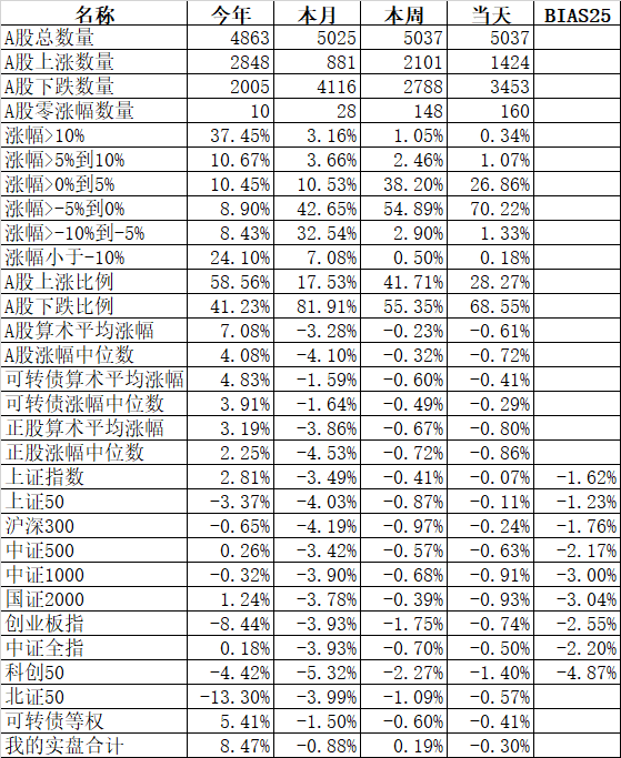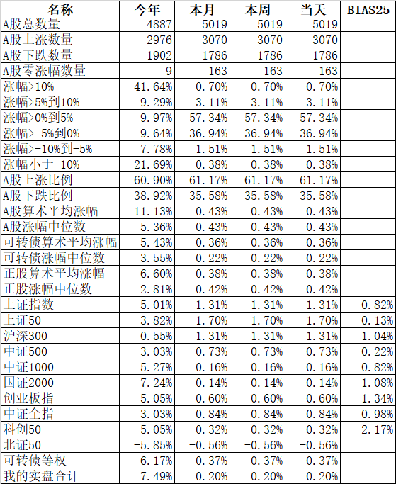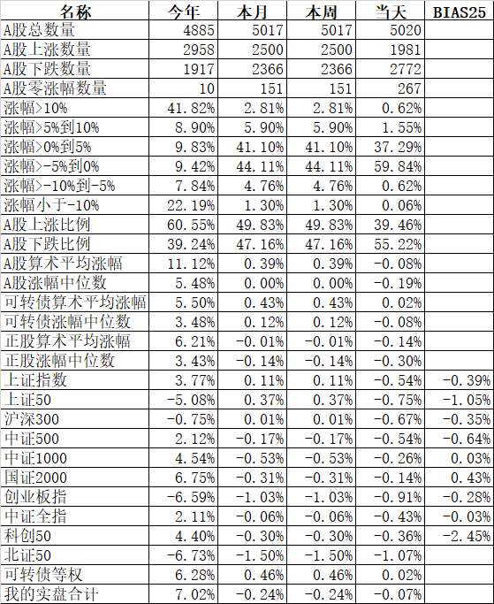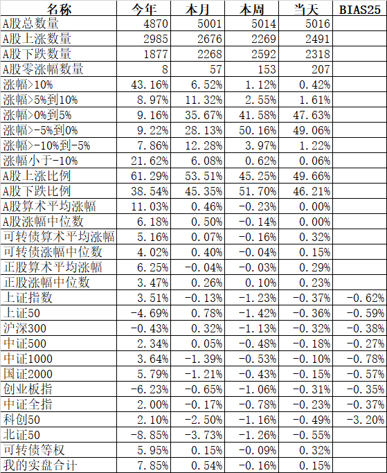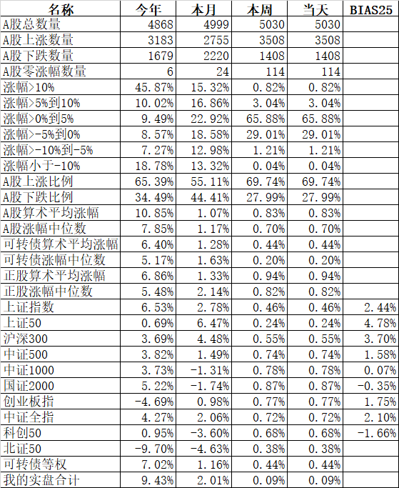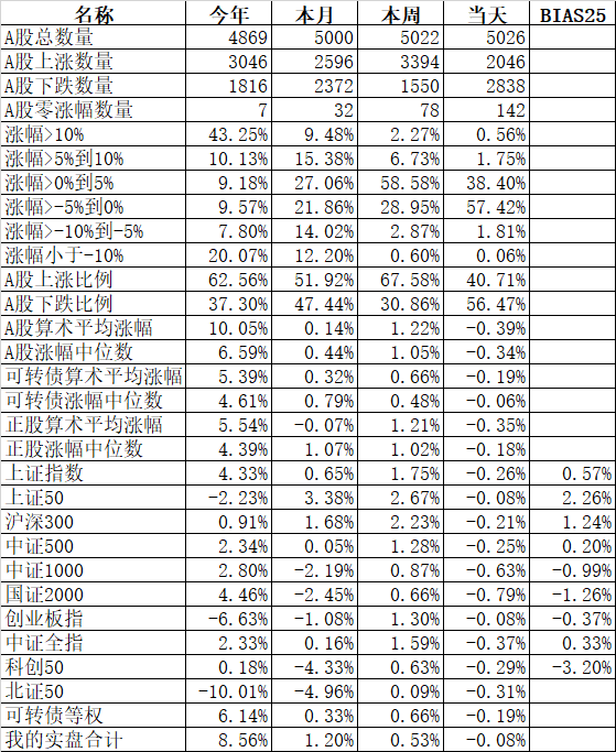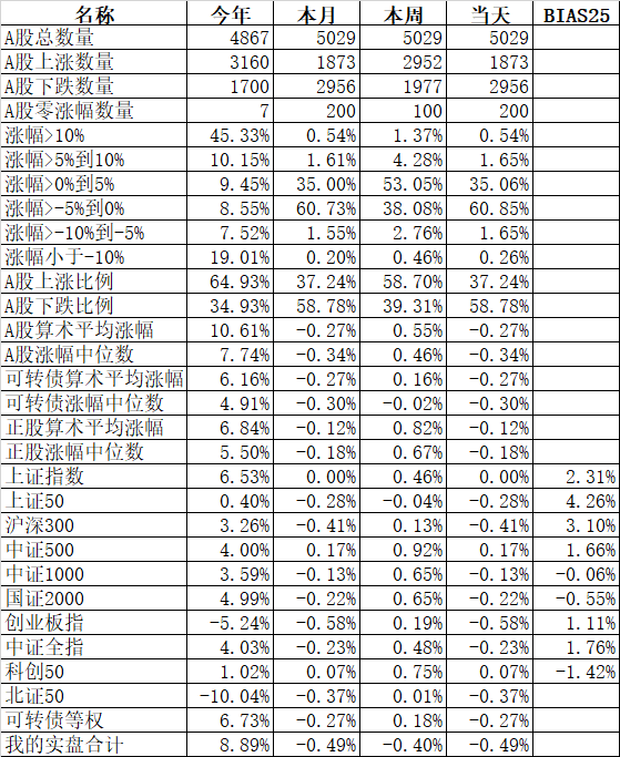 585只个股上涨,4387只个股下跌,涨幅中位数为负的1.78%。经过今天这样一跌,今年个股的涨幅中位数只剩下0.90%了,但今年还是上涨的个股比下跌的个股数量多,而主流的宽基指数全部在水下,说明今年的行情还是个股优于指数,可转债、小市值今年表现相对好些就不奇怪了。