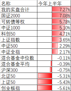 最后一周的最后4天发力,最终账户合计收益率跑赢了所有对标的数据。上半年最差的3个指数:创业板指、上证50、北证50,下跌均超过5%,沪深300指数也下跌了0.75%,而按照天天基金网提供的数据,7231只混合基金中,上半年收益率的中位数是-0.11%,算术平均数是-0.39%,都是亏损...