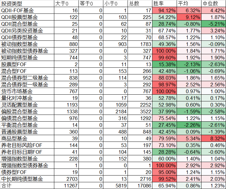 当然,各类债券基金的情况好很多了,各类债券基金,从被动指数型、短期型、混合二级、混合一级、偏债混合、增强指数型、FOF、中长期型,基本上胜率都在90%左右,只有偏债混合型基金,因为含股票的比例略高,所以胜率只有75.54%。