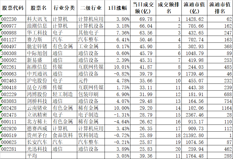 申万一级行业指数中领涨的通信涨3.87%、计算机涨3.17%、传媒涨3.01%;领跌的美容护理跌2.36%、环保跌1.40%、电力设备跌0.88%。今天的主力军还是今年的当红品种TMT。