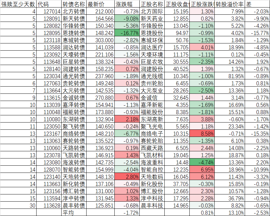 今天496只可转债平均上涨0.39%,对应正股平均上涨1.37%,很明显,今天可转债对应正股的表现强于全市场,但可转债严重跟不上正股的涨幅,特别是130元以上的可转债。查一下明细,477元的横河转债,今天正股涨2.07%,可转债跌5.85%,溢价率186.01%;292.5元的亚康转债,今天正股涨2.31%,可转债大跌6.55%,溢价率58.11%;256.304元的新港转债,正股微涨0.19%,可转债大跌4.01%,溢价率高达115.30%。基本上都是柚子炒作的妖股,今天虽然正股上涨,但可转债中十有八九柚子走了,导致无视正股上涨可转债大跌。