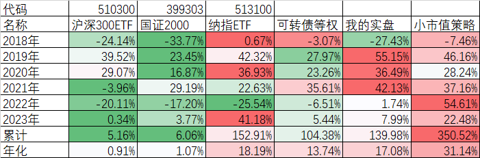 转债等权指数是从2018年开始的,不到6年时间指数翻了一番,相比较上证指数和沪深300甚至我拿来替代可转债正股表现的国证2000要好很多了,即使和纳斯达克100指数相比,差异也不大。我自己的实盘不仅跑赢了转债等权而且也跑赢了纳指100。