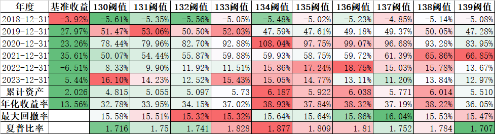 其中从130阈值到无阈值都是借助禄得网回测的结果,排名是我的多因子策略(抱歉不公开),5个交易日轮动一次,平均持有30只,实盘是有空就轮动,平均大概10天左右。
