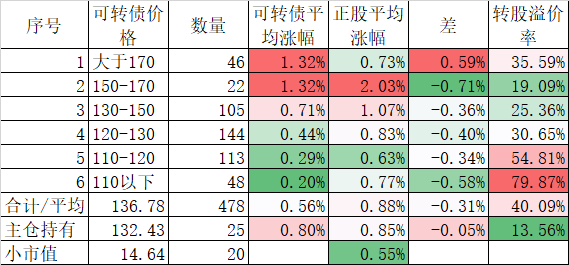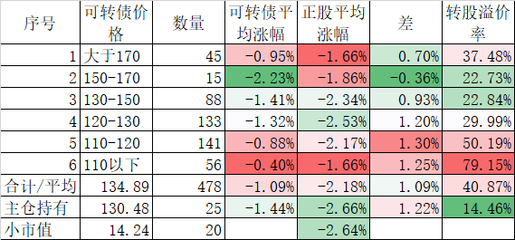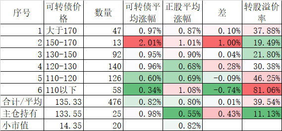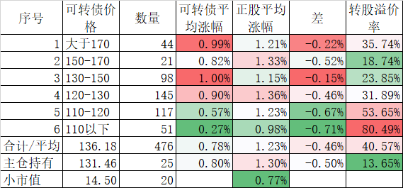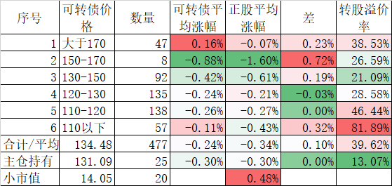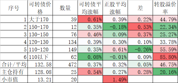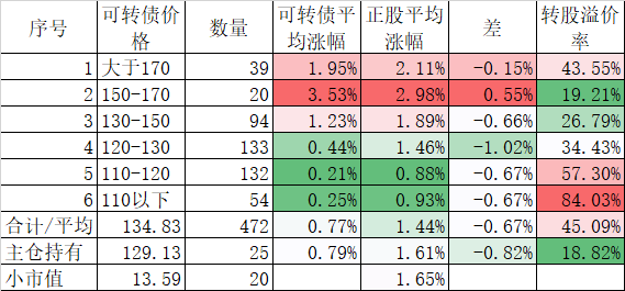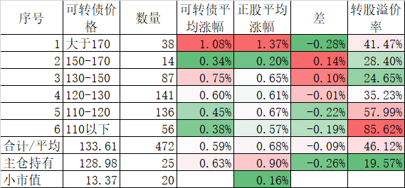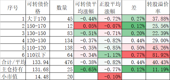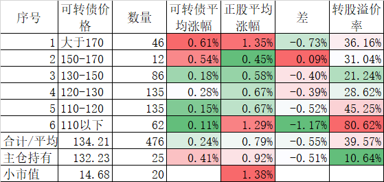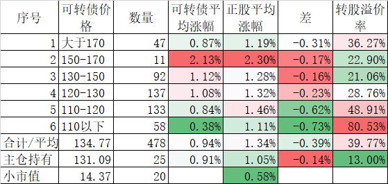今天虽然可转债上涨的不错,但相对指数还是弱。471只可转债对应的正股平均上涨1.15%,可转债平均上涨0.83%。