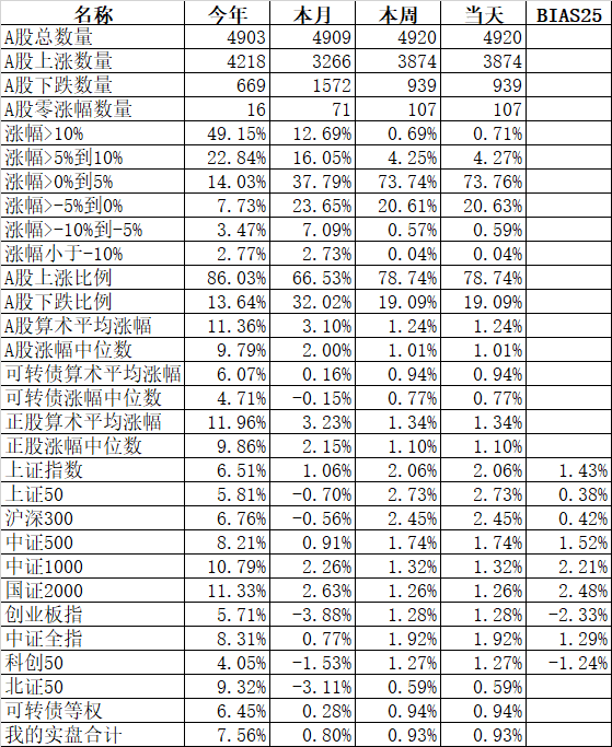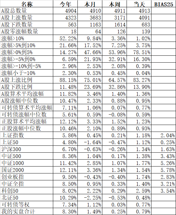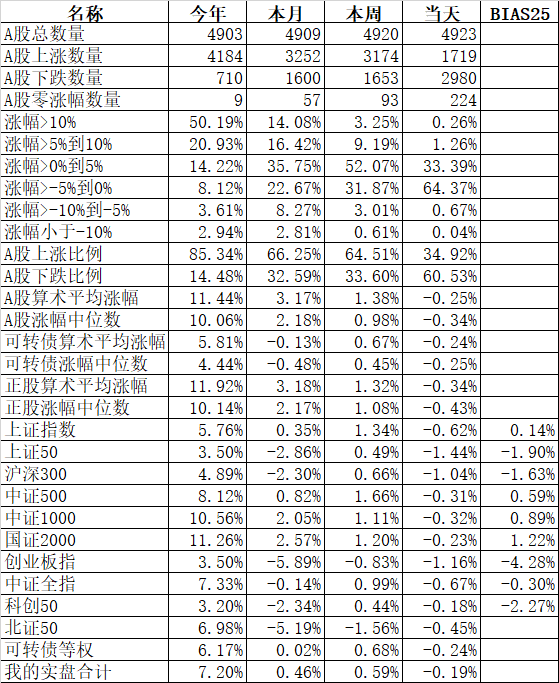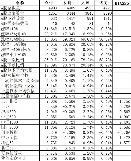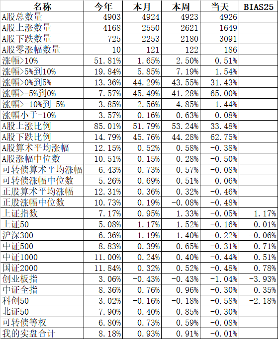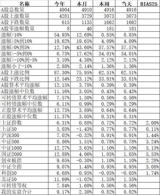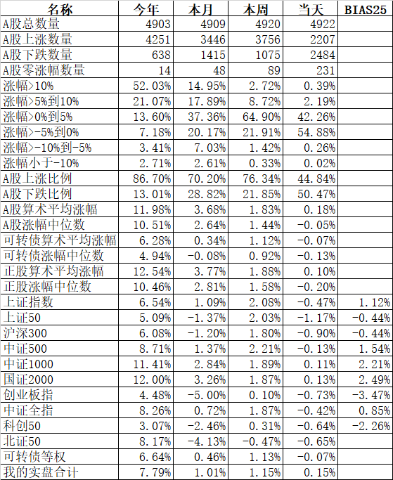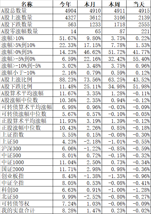 今天我的可转债持仓表现不错,但小市值表现相对弱,拖了后腿。虽然今年4.03%的收益率跑赢了可转债等权指数,但全部跑输了主流的宽基指数。好几个网友都说是不是要换赛道了。