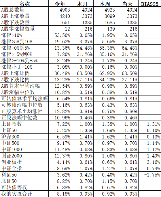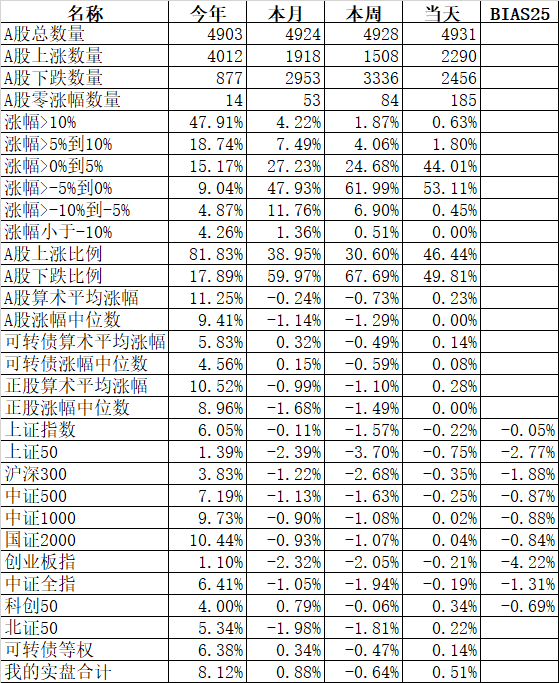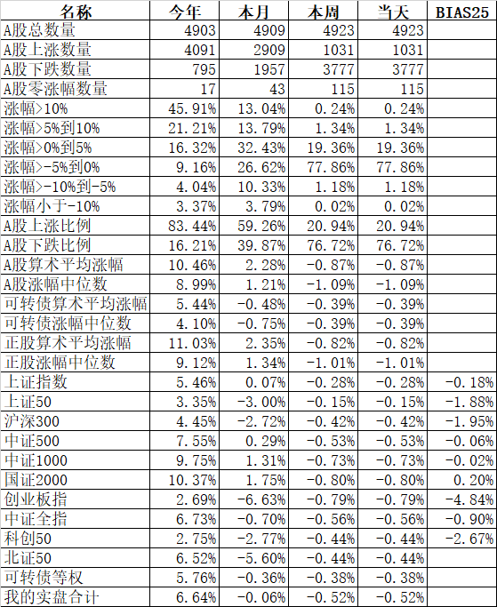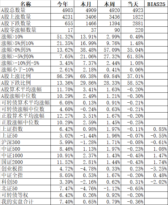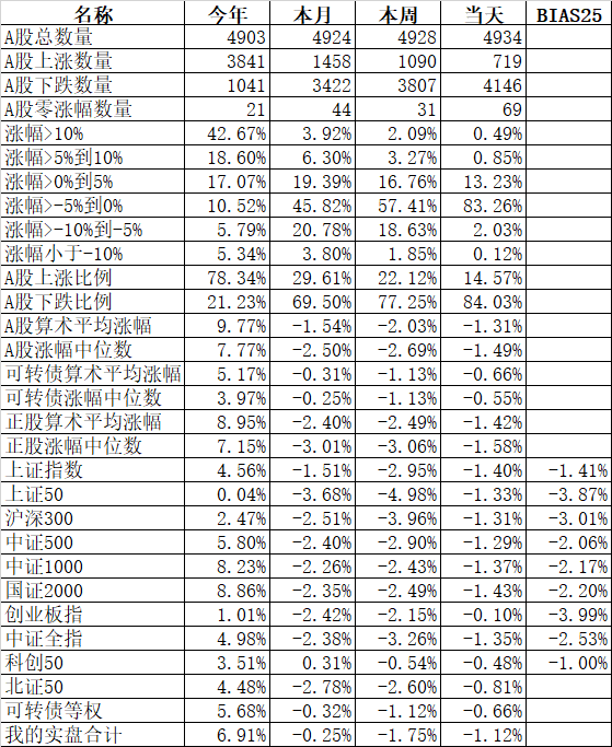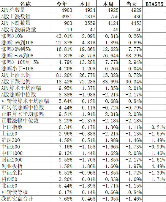 今年股票的涨跌和这个因子关系最大本来我估计小幅调整的,今天又被打脸了。 主流宽基指数中跌幅最小的创业板指跌0.10%、科创50跌0.48%,跌幅最大的国证2000跌1.43%,中证1000跌1.37%。申万一级行业指数全部下跌,跌幅最小的医药生物跌0.28%、计算机跌0.55%、电力设备跌0.74%;跌幅最大的汽车跌3.49%、建筑材料跌2.51%、家用电器跌2.49%。个股呈现一九现象,仅有7...