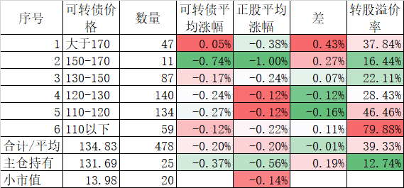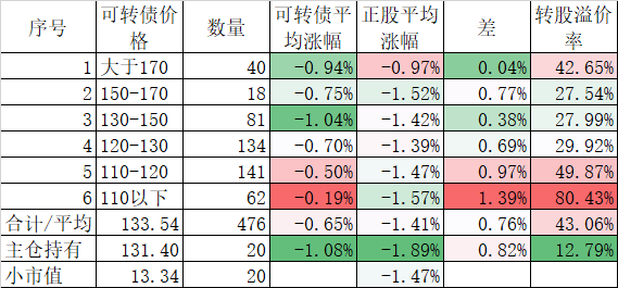 可转债今天也不能幸免,476只可转债平均下跌了0.65%,正股平均下跌了1.41%。我今天的持仓又在还债了,可转债平均跌了1.08%,小市值平均跌了1.47%。涨停后换出的两个股票:中公高科大跌了7.44%,中设股份大跌了6.12%,而换入的新通联跌了0.73%,法狮龙跌了1.87%。虽然也跌,但跌的少很多了。今天又把涨多了的汇源通信换成了前期涨停卖出的海鸥股份,海鸥股份大涨后连跌5天又进入了目标了。小市值策略就是这样高抛低吸的,平均市值并不会大涨。