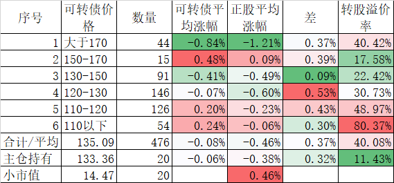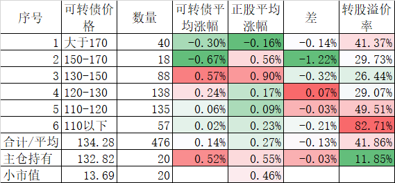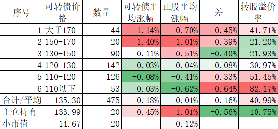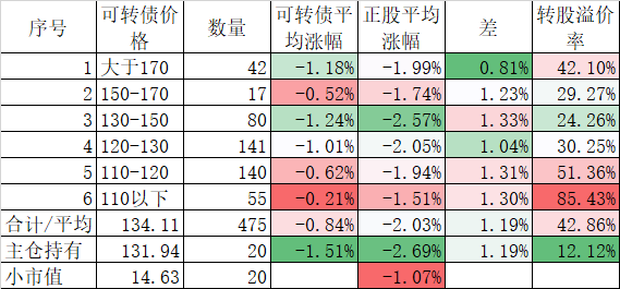 今天可转债整体不错,476只可转债对应的正股平均上涨0.27%,可转债平均上涨0.14%。20只主仓的持仓平均上涨了0.52%,主要是昨天大跌的寿22转债今天又大涨了4.67%。账户整体合计涨了0.51%,在连续跑输两天后又跑赢了等权指数。