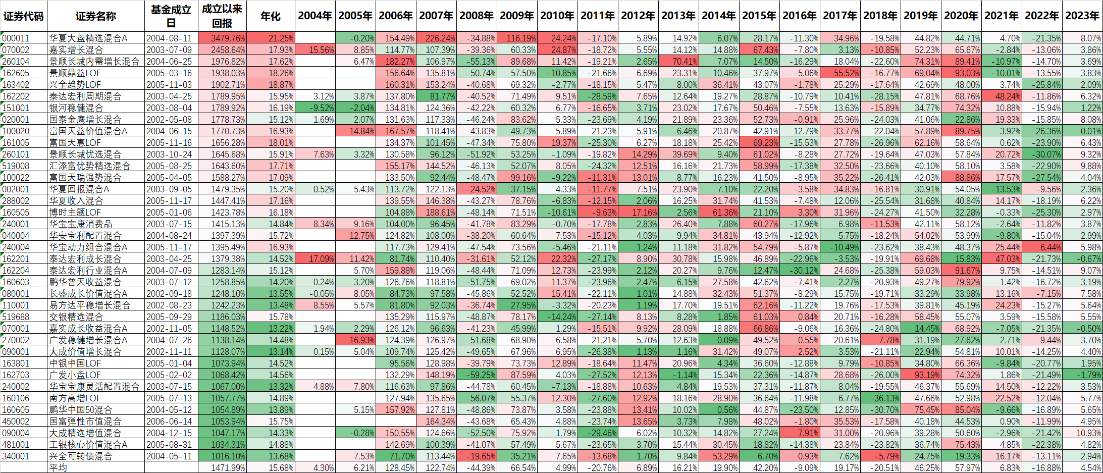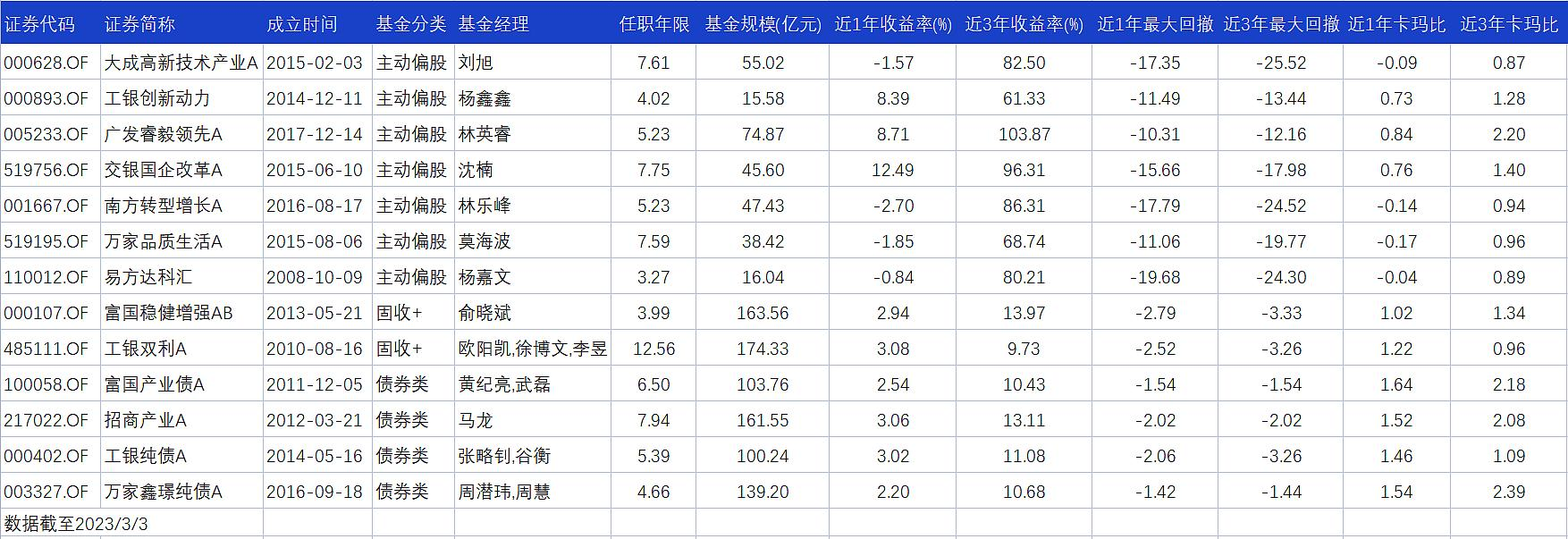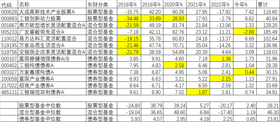 以上数据截止到2023年3月10日,从2018年的5年多累计来看,13只基金全部超过了对应类型基金的中位数,这说明这13只基金肯定是经过精心挑选的。但如果看每年的收益率和当年同类基金的中位数比,很少有基金每年都能超越的,13只基金里也只有股票型的大成高新和债券型的招商产业,能在这6年里包括今年也超越同类基金的中位数,另外广发睿毅除了今年跑输外也是连续5年跑赢中位数。