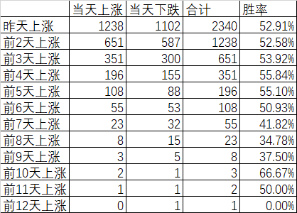 昨天上涨,当天也上涨的比例是52.91%,一直到前4天上涨,也就是比“红三兵”多1天,继续上涨的比例高达55.84%,然后随着连续上涨的天数的增加,剔除10天11天数据太少的因素,胜率基本上是逐步走低。这种现在的解释是连续上涨天数多了,由于惯性的原因继续上涨的概率增大,但大到一定程度(连涨4天后),均值回归走向反面。