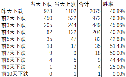 我们再看连续下跌,1天下跌第2天继续下跌的比例是46.89%,基本上都没超过50%,这种现象可以用市场毕竟还是上涨的天数比下跌的天数多来解释。