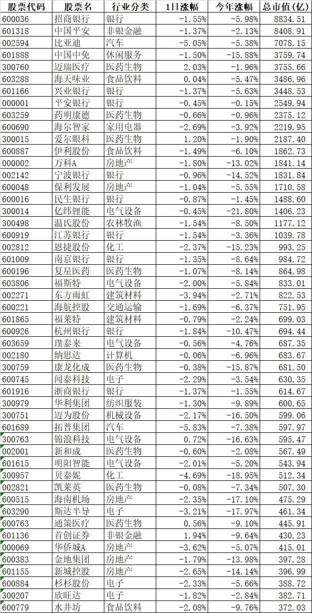 今天一跌,最难看应该是上证50,今年的涨幅缩小成0.04%了,估计下周开盘就破了。指数还算没捅破这层窗户纸,但个股今天有380只创了今年的新低,其中市值较大的有招商银行、中国平安、比亚迪、中国中免、迈瑞医疗、海天味业、兴业银行、平安银行、药明康德、海尔智家、爱尔眼科、伊利股份、万科A、宁波银行、保利发展、民生银行、亿纬锂能、温氏股份、江苏银行、恩捷股份、南京银行、复星医药、福斯特、东方雨虹等,下表是其中50家最大市值的公司: