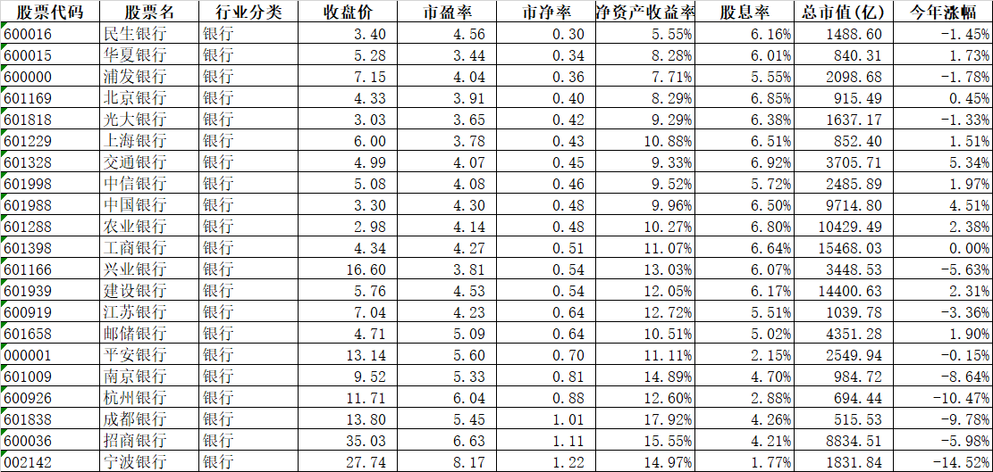 最后再看一个银行业,在沪深300指数中的21家银行中,涨幅最高的交通银行虽然不是市净率最低的,但也是比较低的,而跌幅最大的5家银行:宁波银行(-14.52%)、招商银行(-5.98%)、成都银行(-9.78%)、杭州银行(-10.47%)、南京银行(-8.64%),正好全部都是市净率最高的5家银行,而且银行今年的涨幅和市净率的相关度高达-79.52%。
