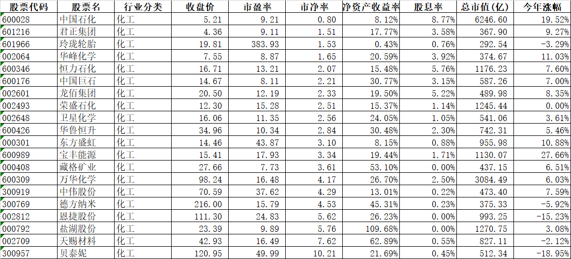 再看化工行业,20家公司中,市净率最低的中国石化,今年涨幅19.52%,仅次于宝丰能源的27.66%,而市净率最高的贝泰尼,今年跌幅高达18.95%,在行业里垫底。在化工行业中,今年涨幅和市净率的相关度高达-65.09%,比采掘更加明显。